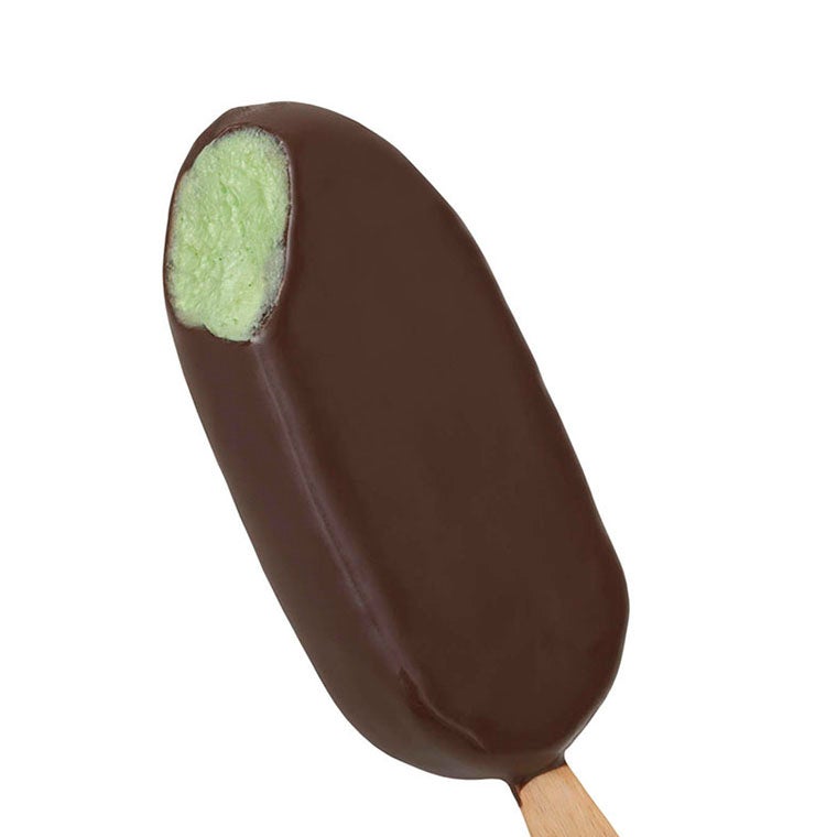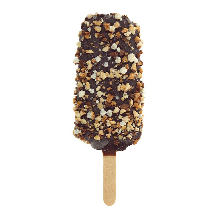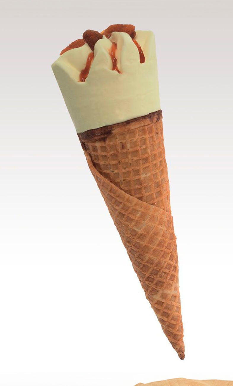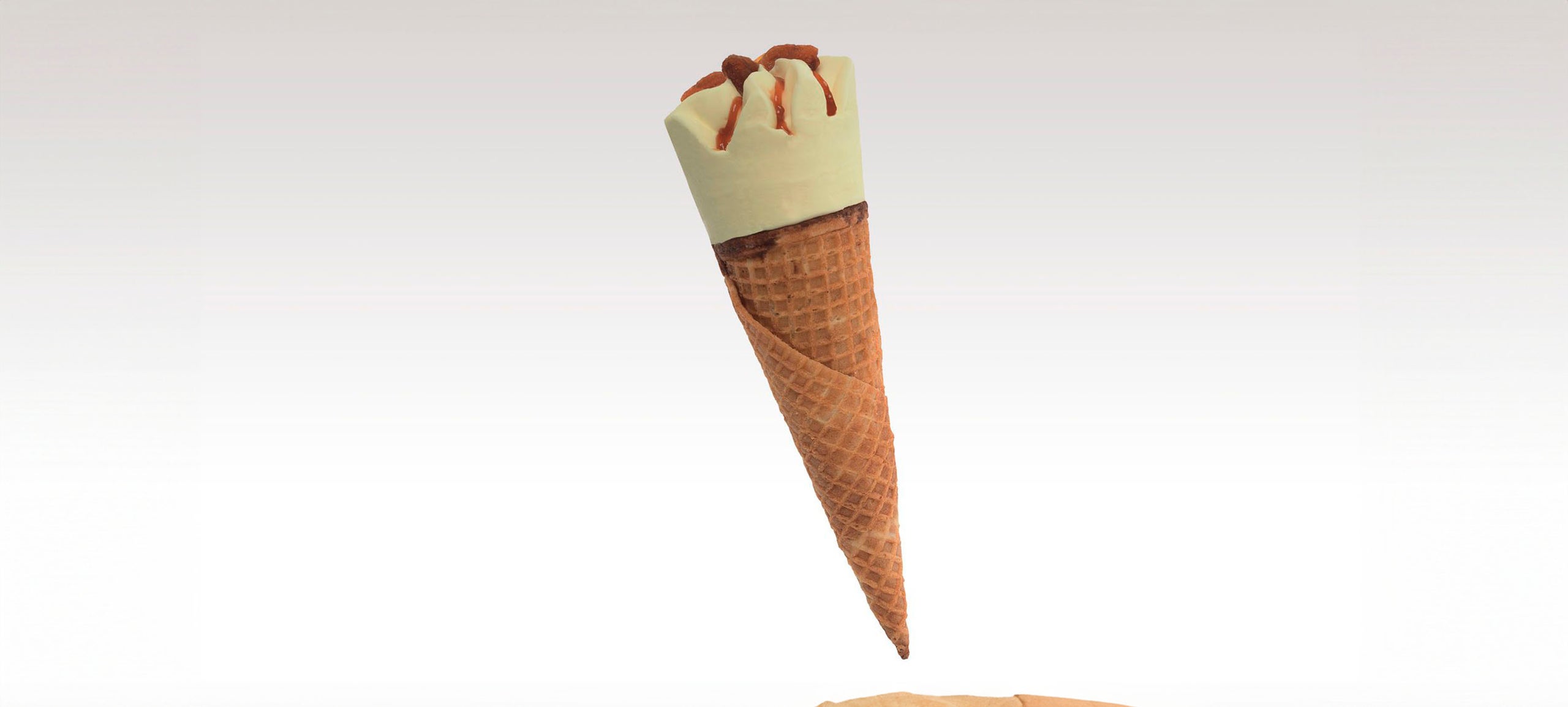 Dairy ice cream with whisky cream sauce in a cocoa waffle, decorated with raisin.