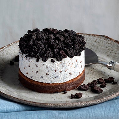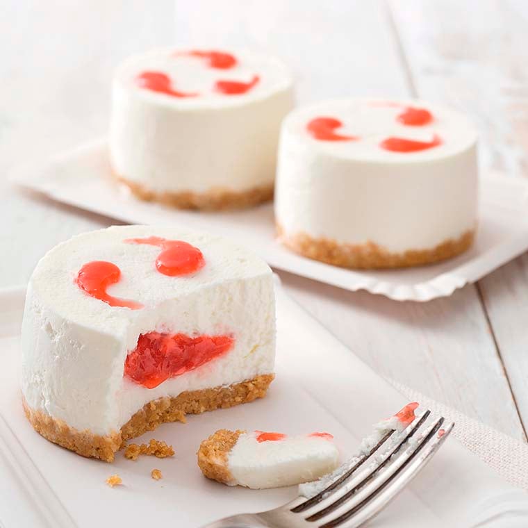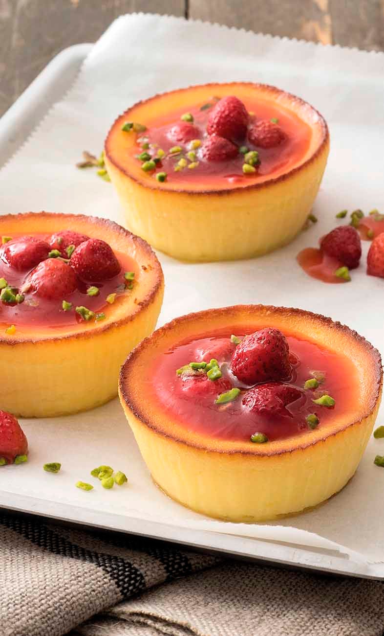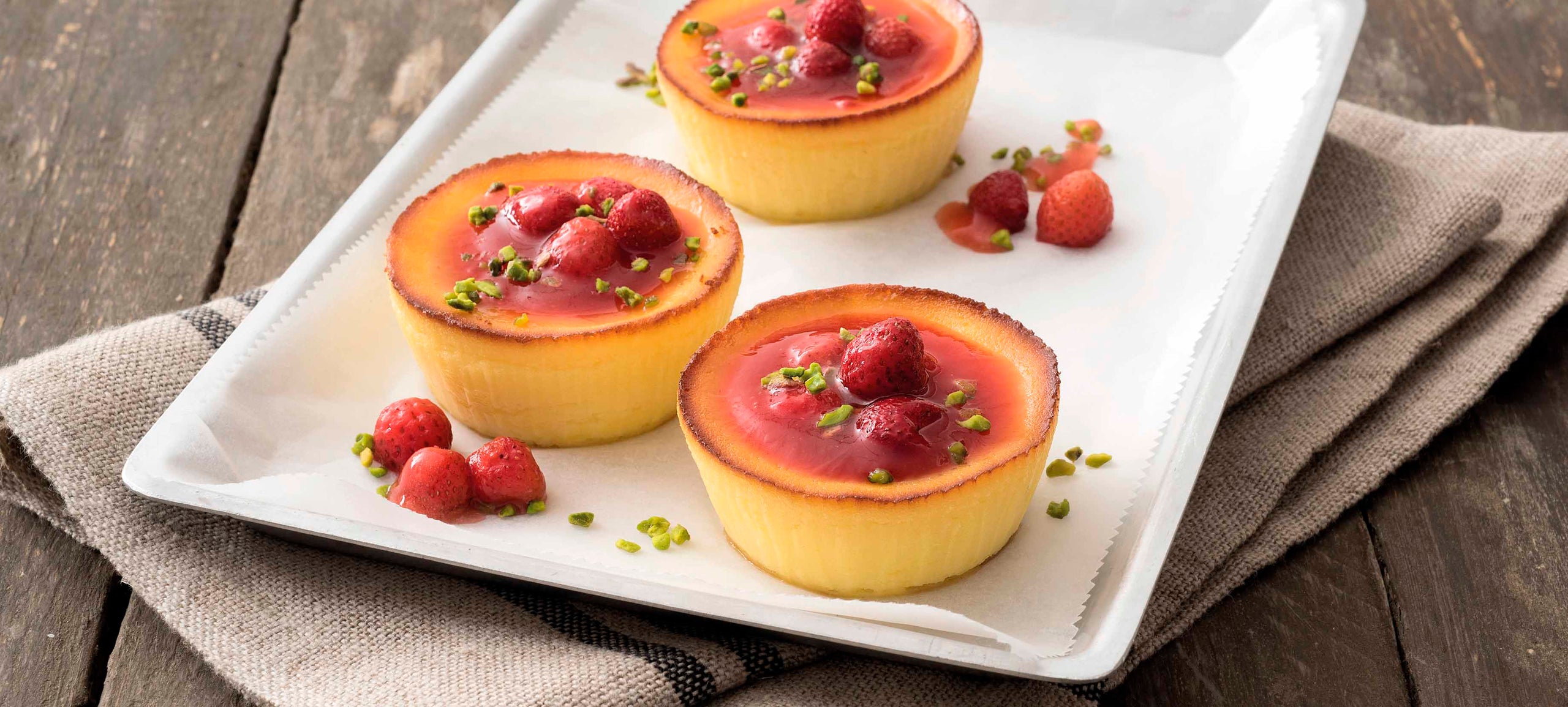 Ricotta and cheese cream topped with strawberries and decorated with chopped pistachios.