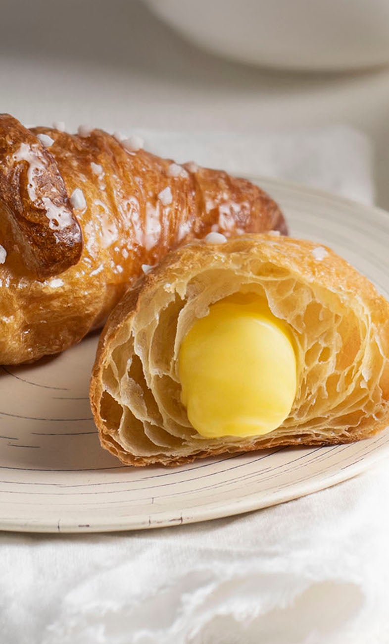 Soft dough with natural yeast. A soft, fluffy fried dough filled with a velvety pastry cream. Decorated with granulated sugar.