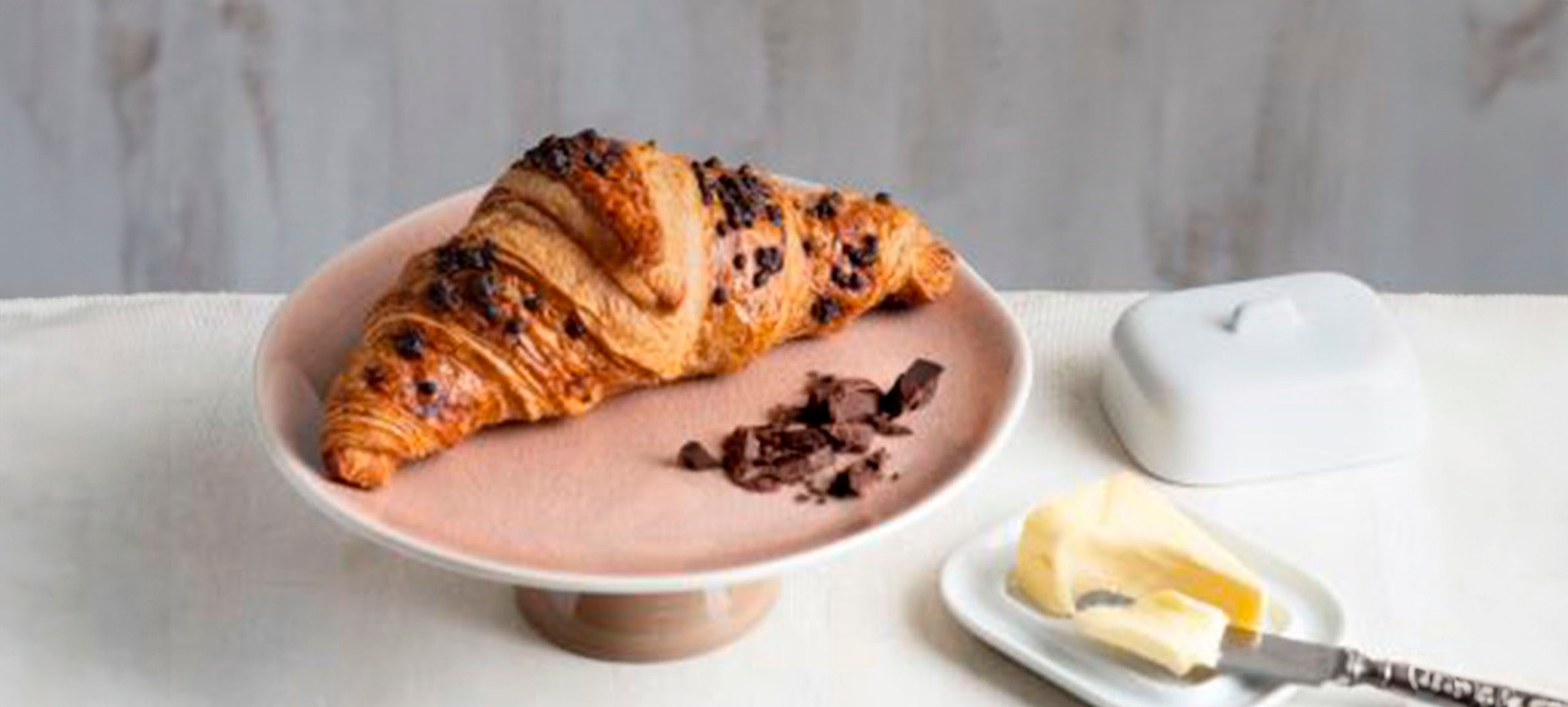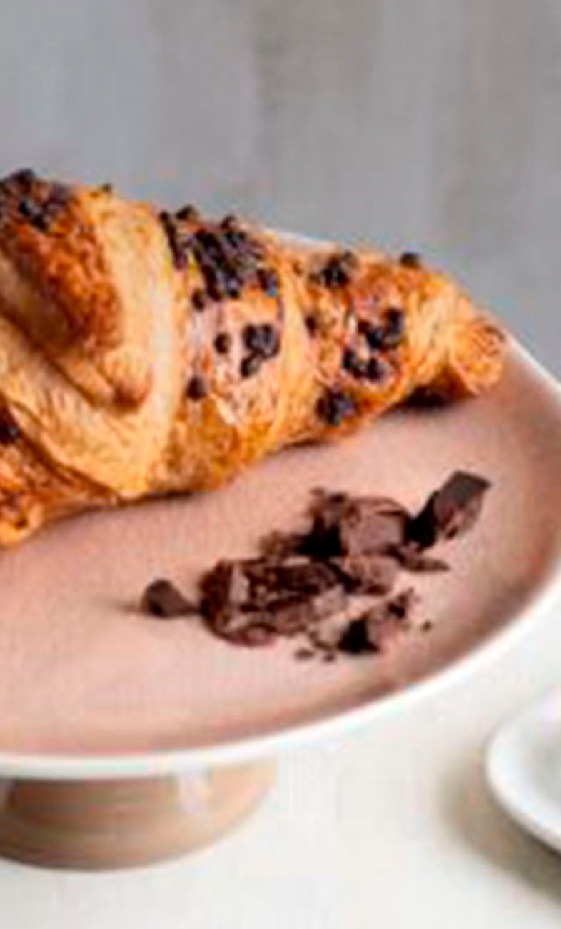 Butter (18%) croissant filled with chocolate and decorated with chocolate chips.