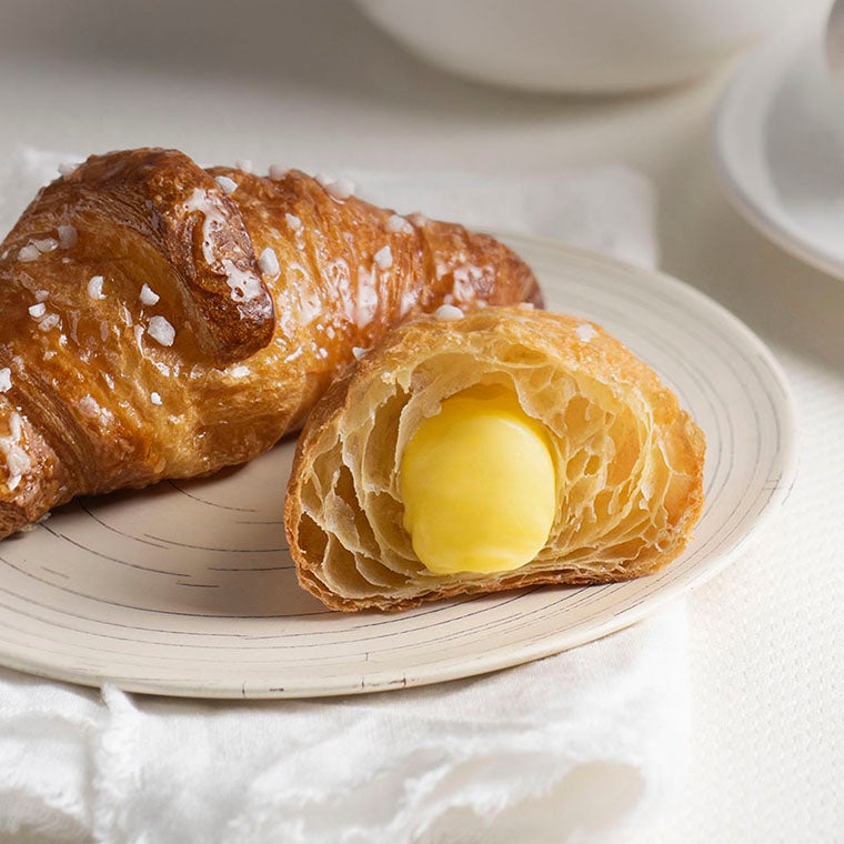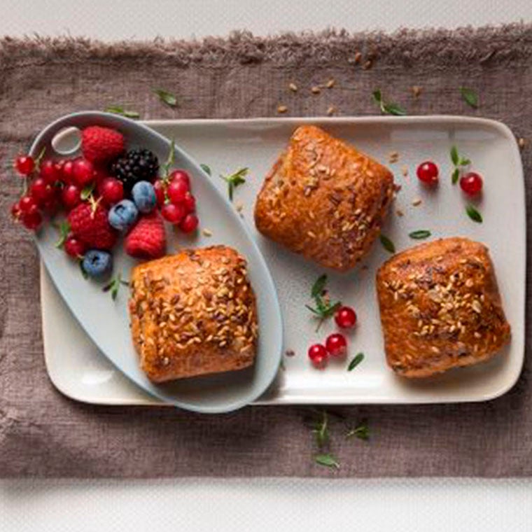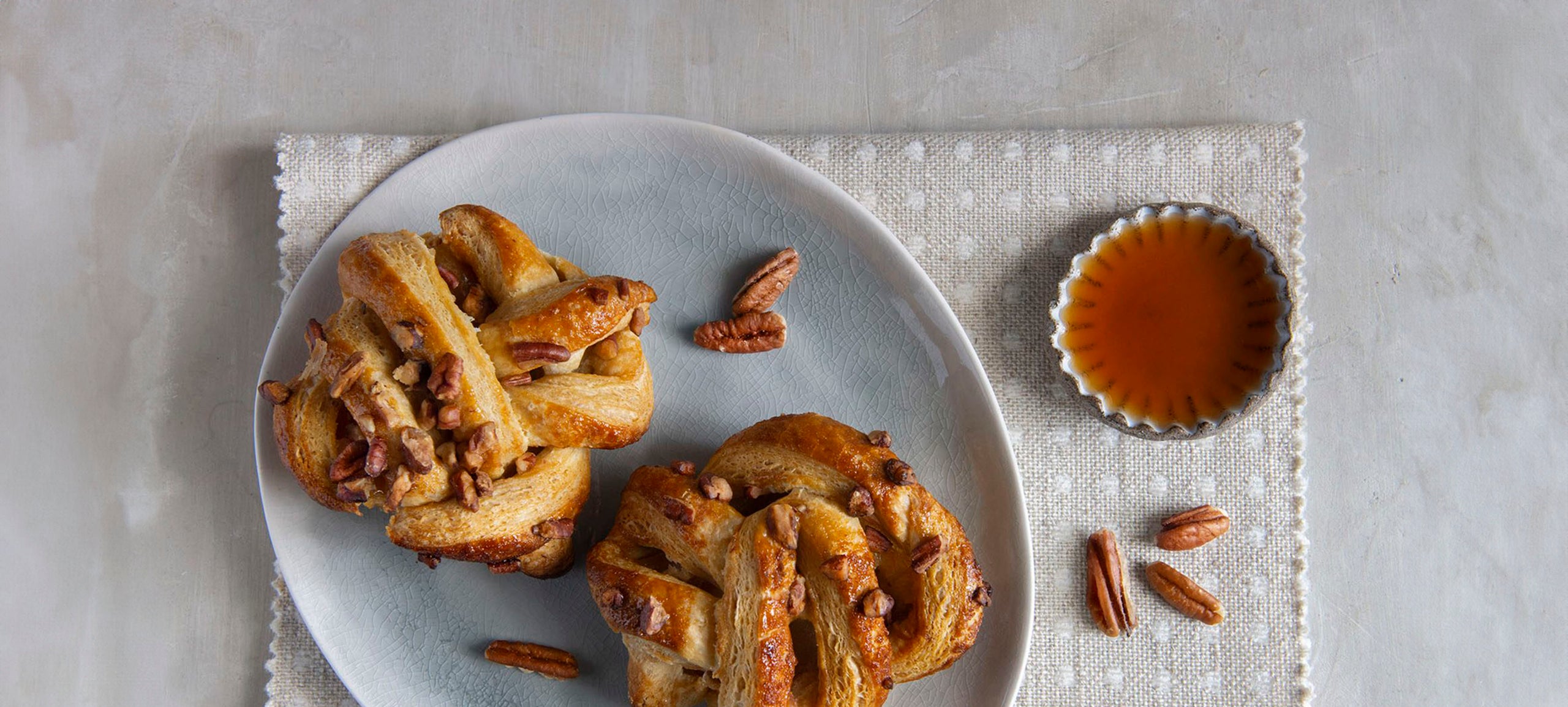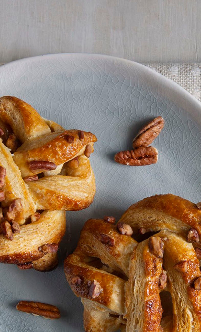 Mini braid of puff pastry, with a delicious maple syrup cream, decorated with Pecan nuts.
