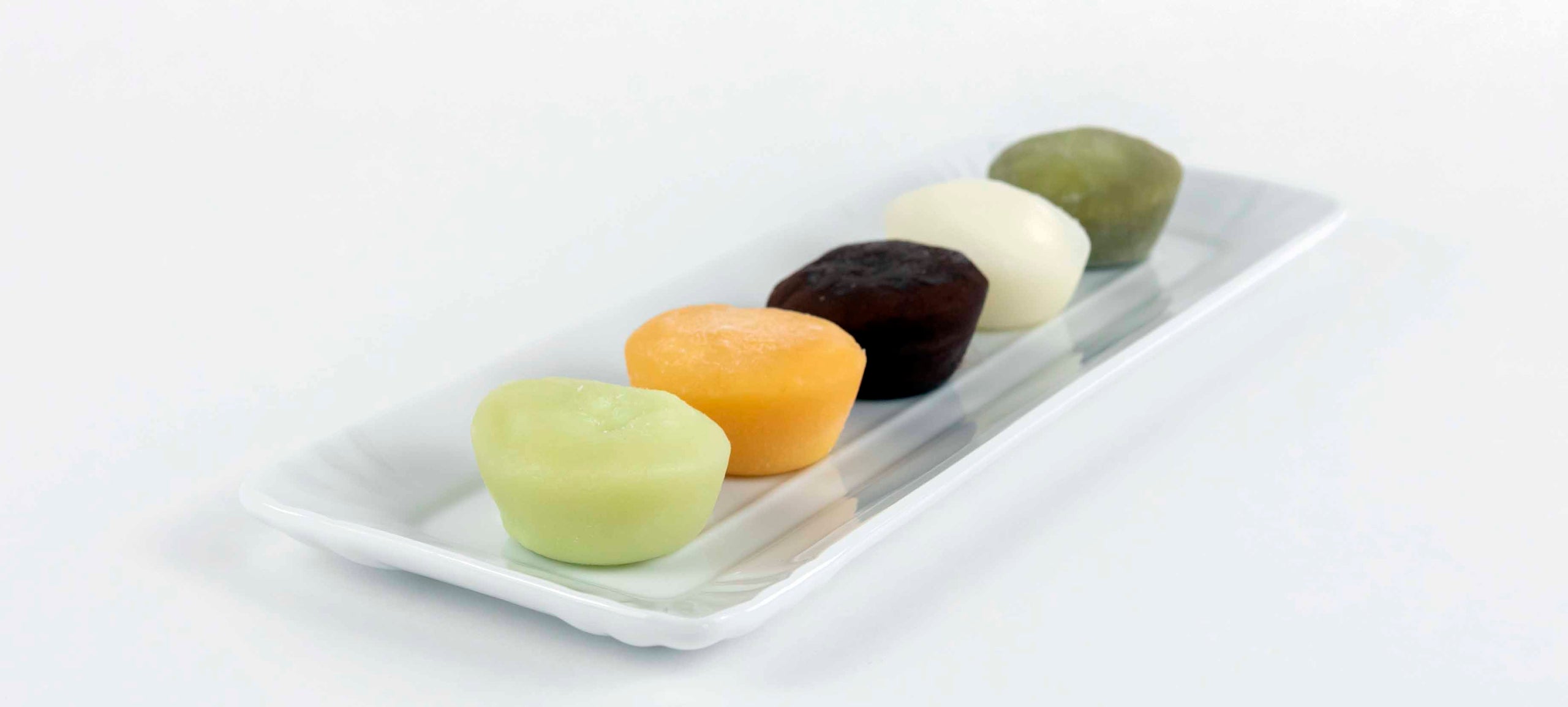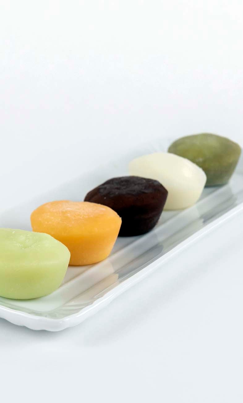 The classic traditional Japanese dessert consisting of a soft covering of rice dough, filled with a creamy ice cream in different flavoures: coconut, pistachio, mango, chocolate and green tea.