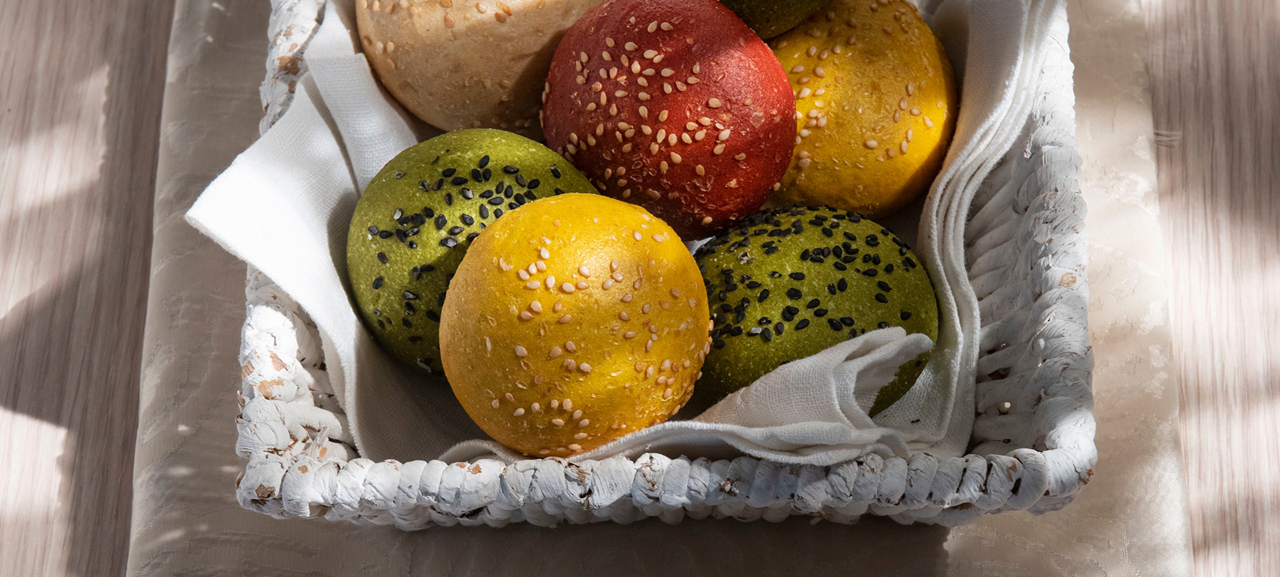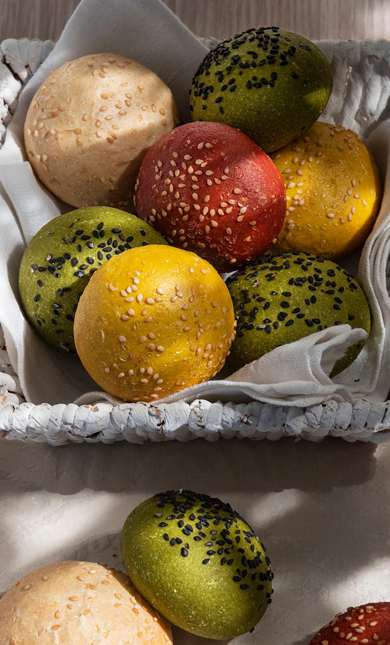 Colorful and elegant bread snack with dough with sesame, beet, turmeric and spinach.