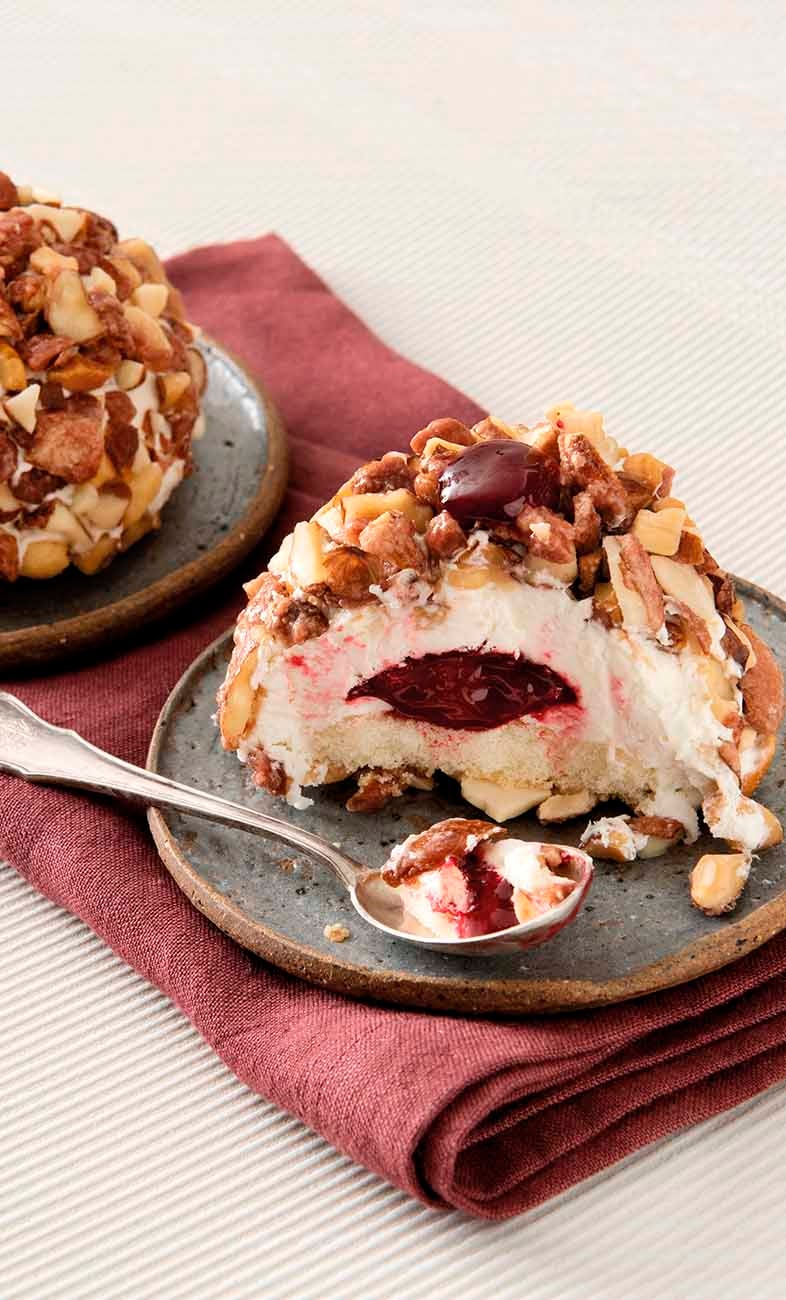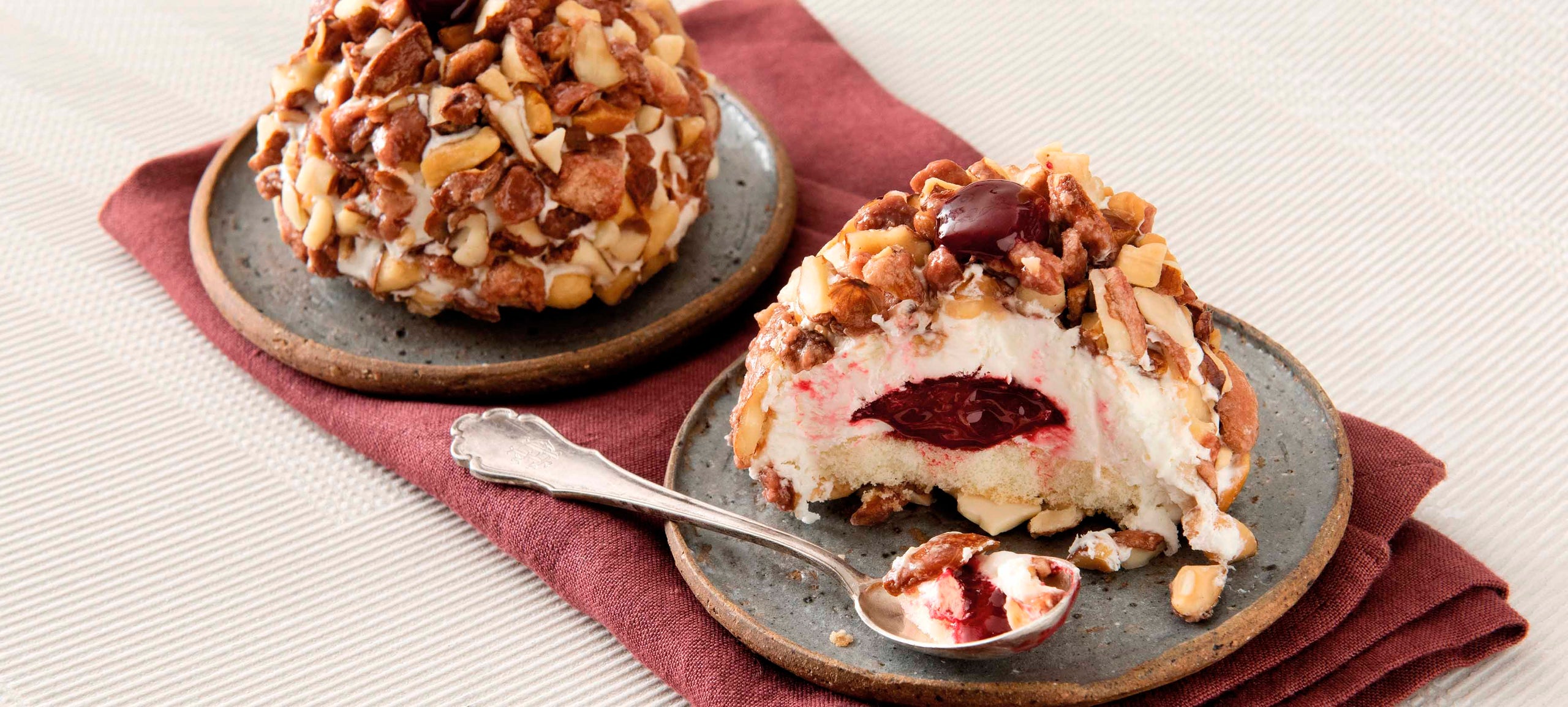 Vanilla flavoured semifreddo with a sour cherry core, covered with caramelized almond.