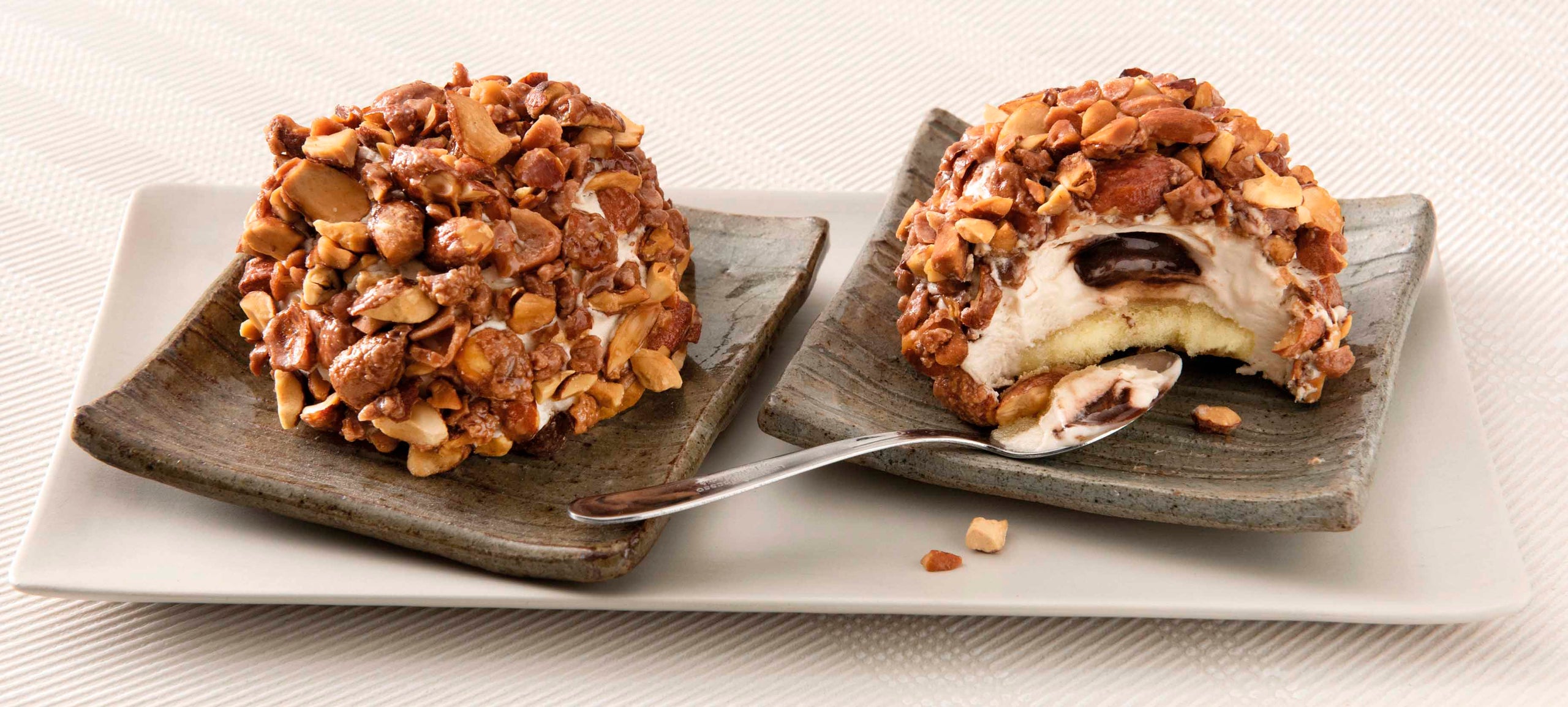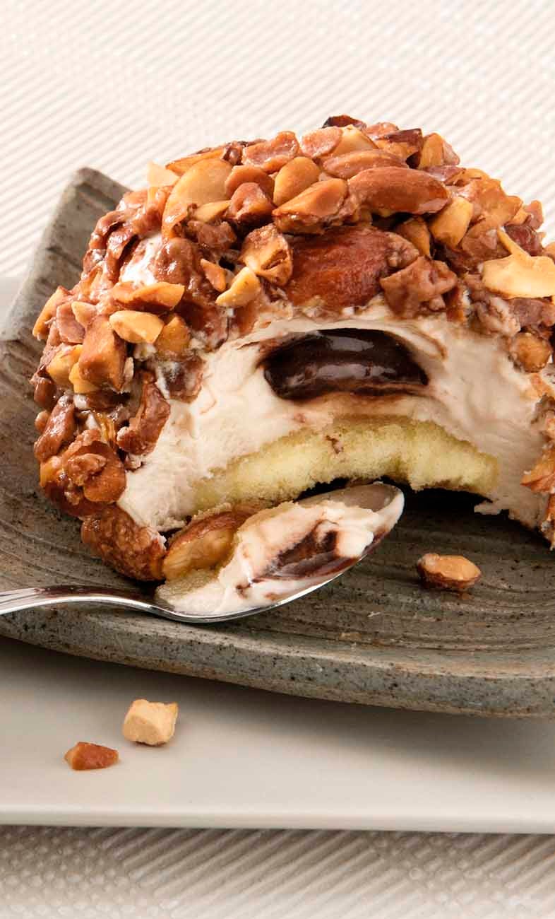 Hazelnut semifreddo with a soft chocolate core, covered with caramelized almond.