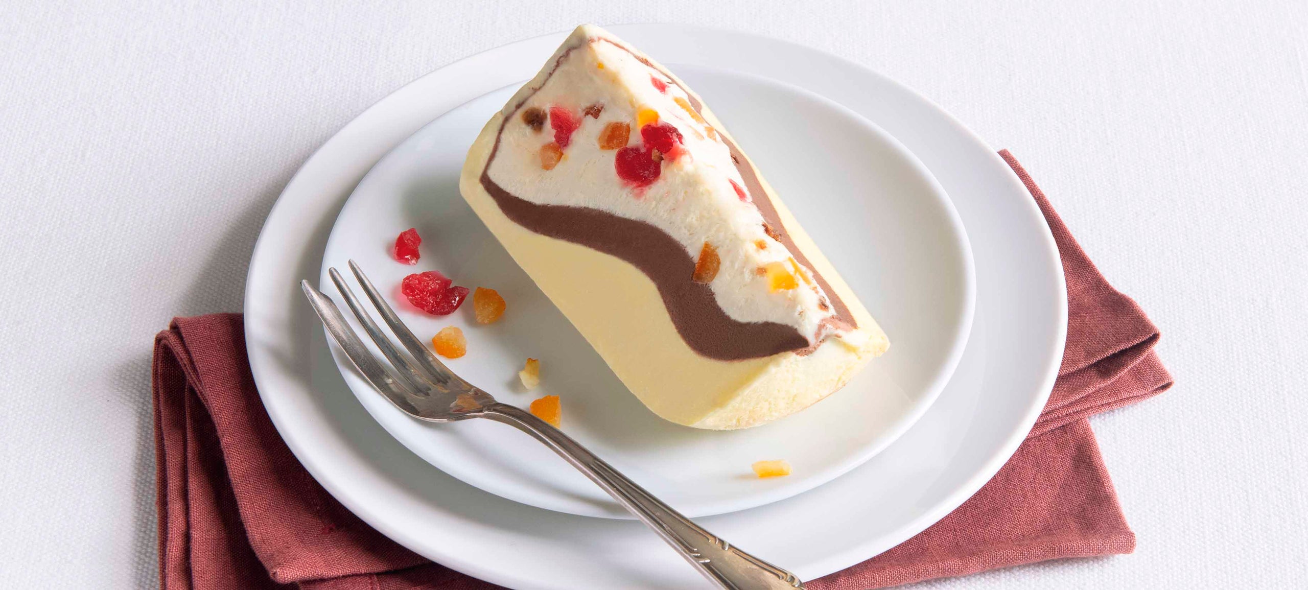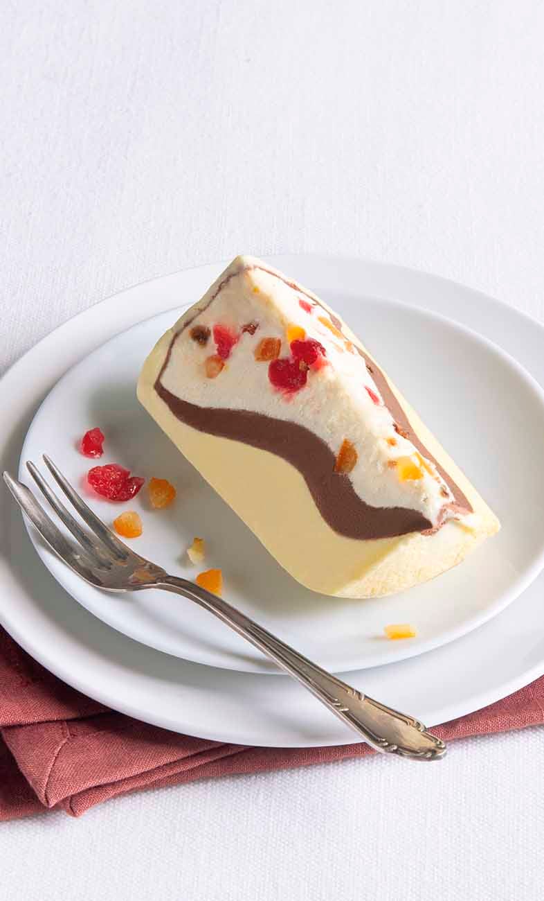 Sabayon, chocolate and cream semifreddo and candied fruit. Wrapped separately.