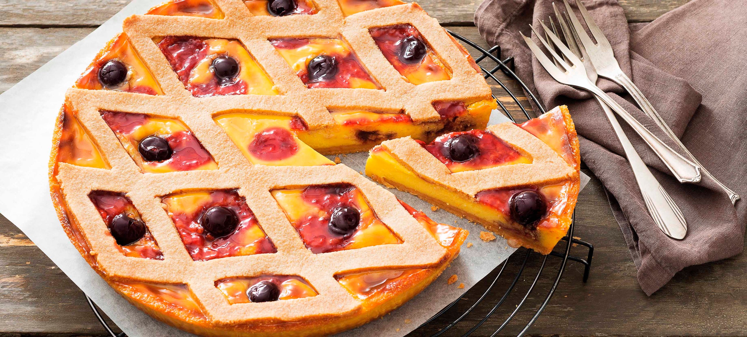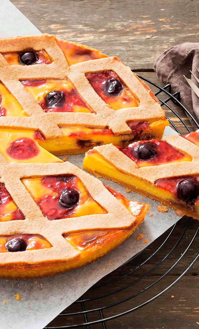 Shortcrust pastry base filled with pastry cream and amarena cherry sauce, topped with amarena.