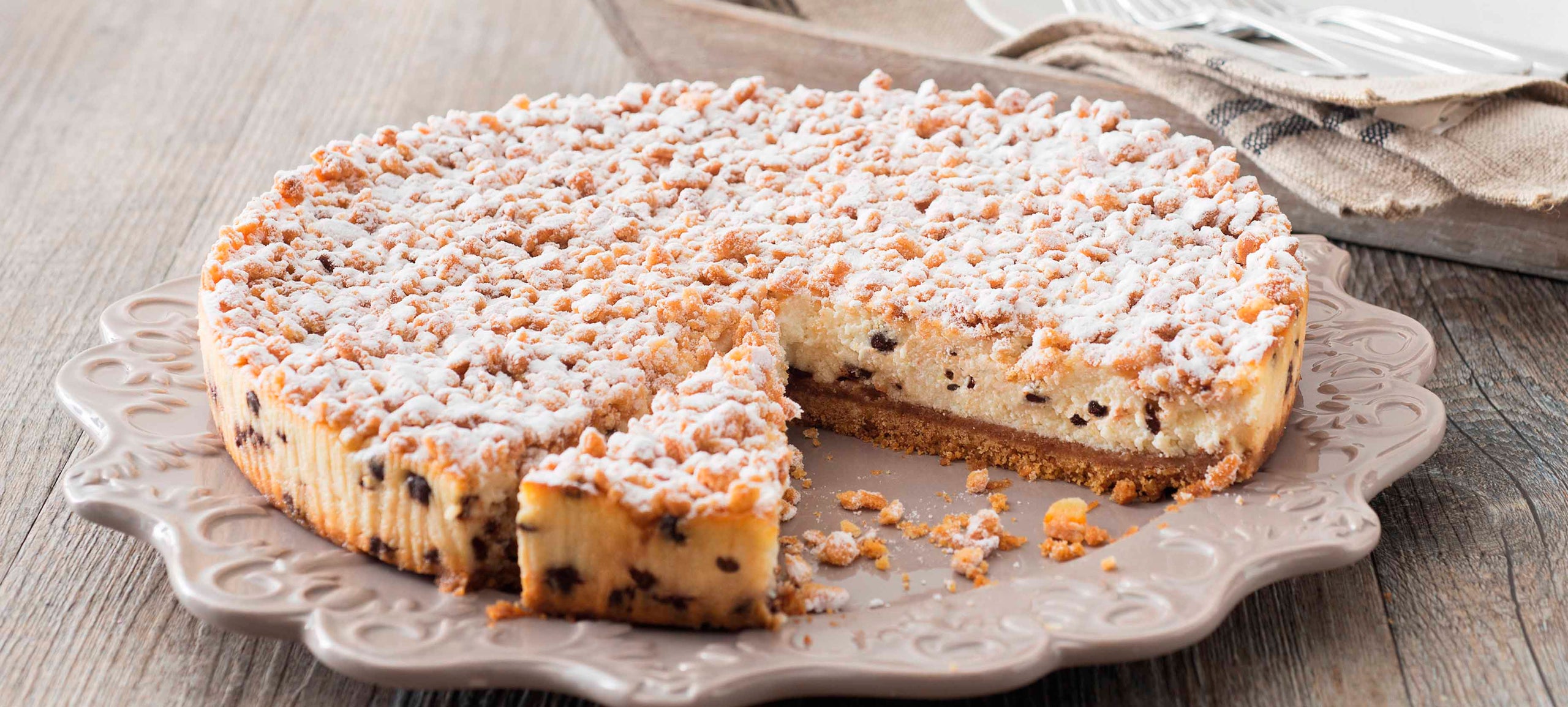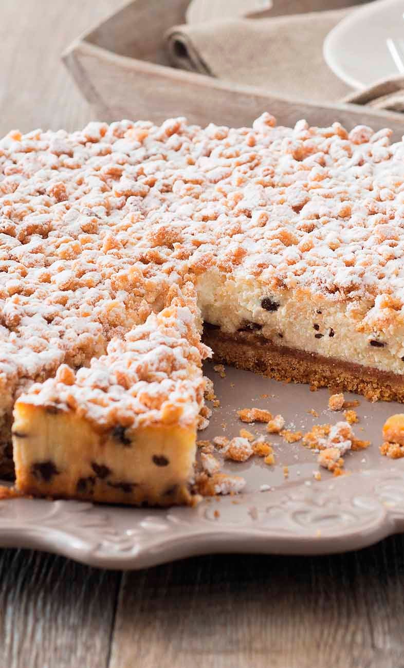 Ricotta cream with chocolate drops and orange peel on a crust base, decorated with short pastry crumble and icing sugar.
