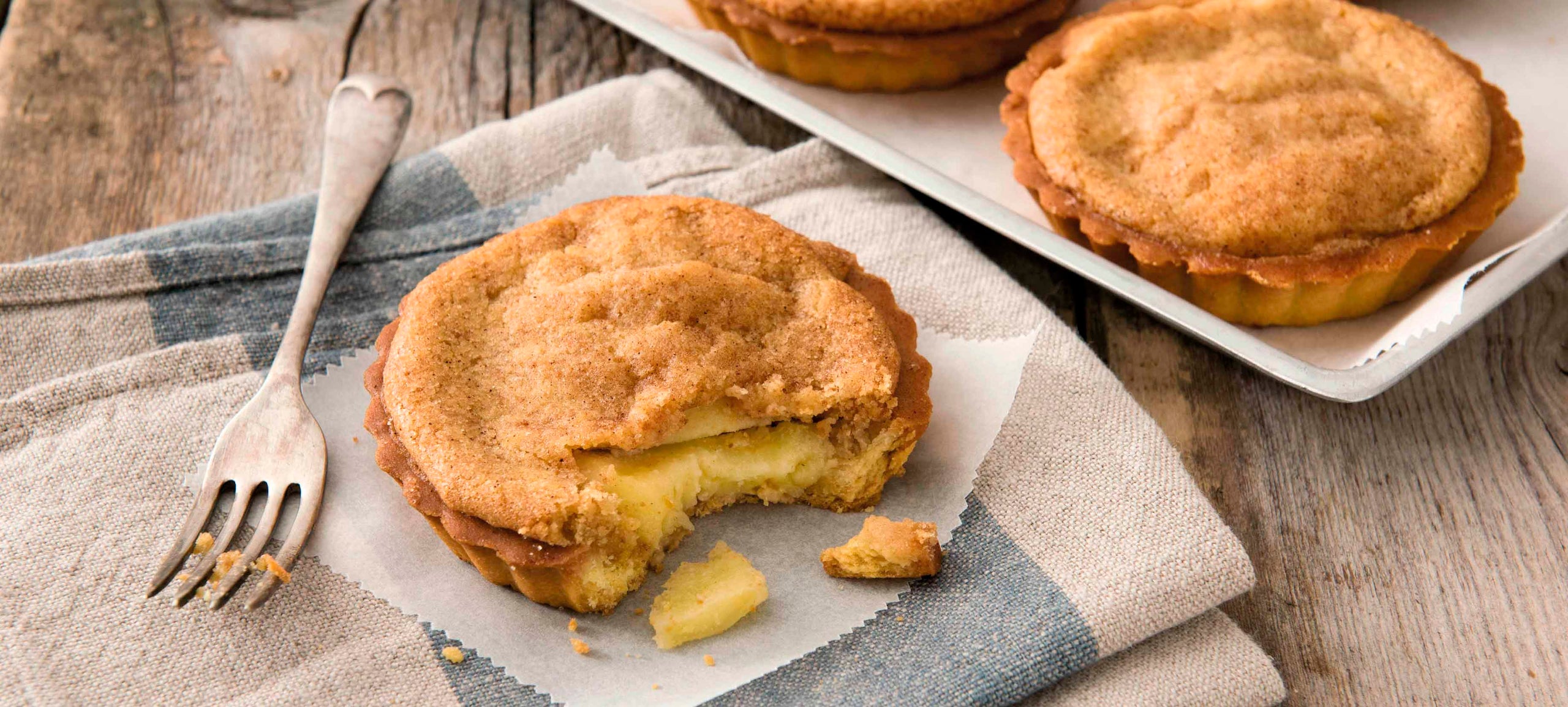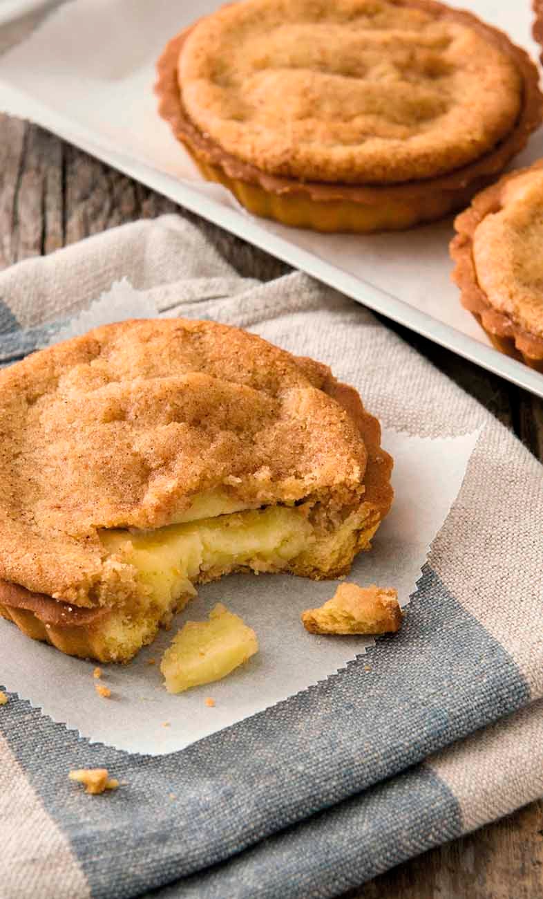 Butter short pastry with apples decorated with sugar and cinnamon.
