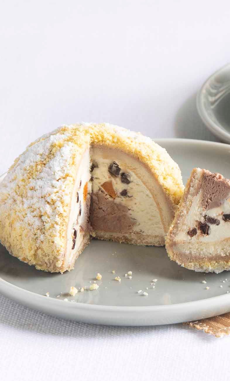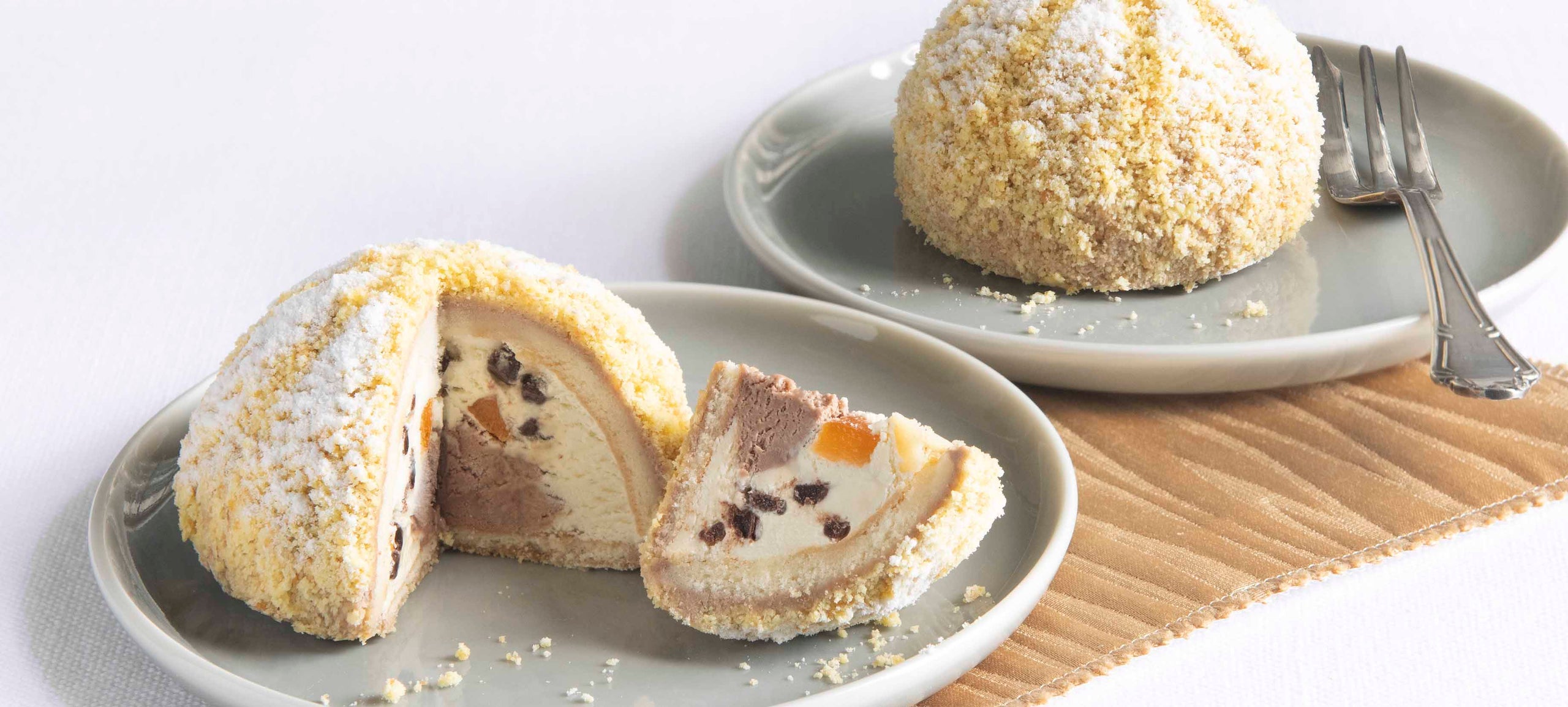 Petite sponge cake dome with cocoa and vanilla scented semifreddo cream, enriched with candied orange and dark chocolate chips.