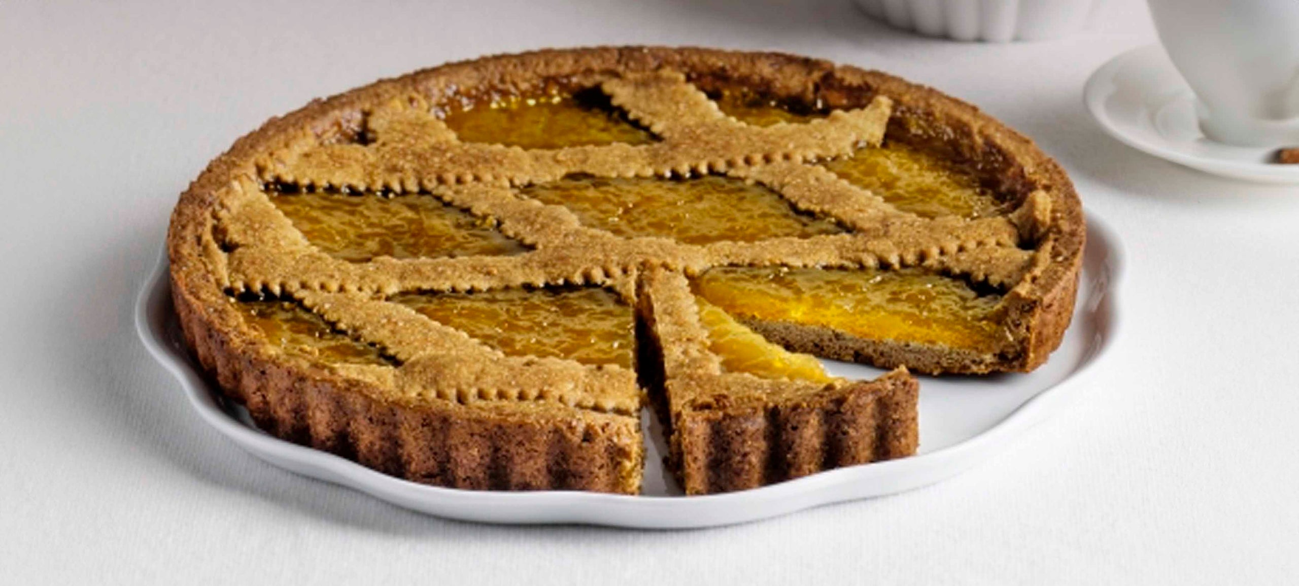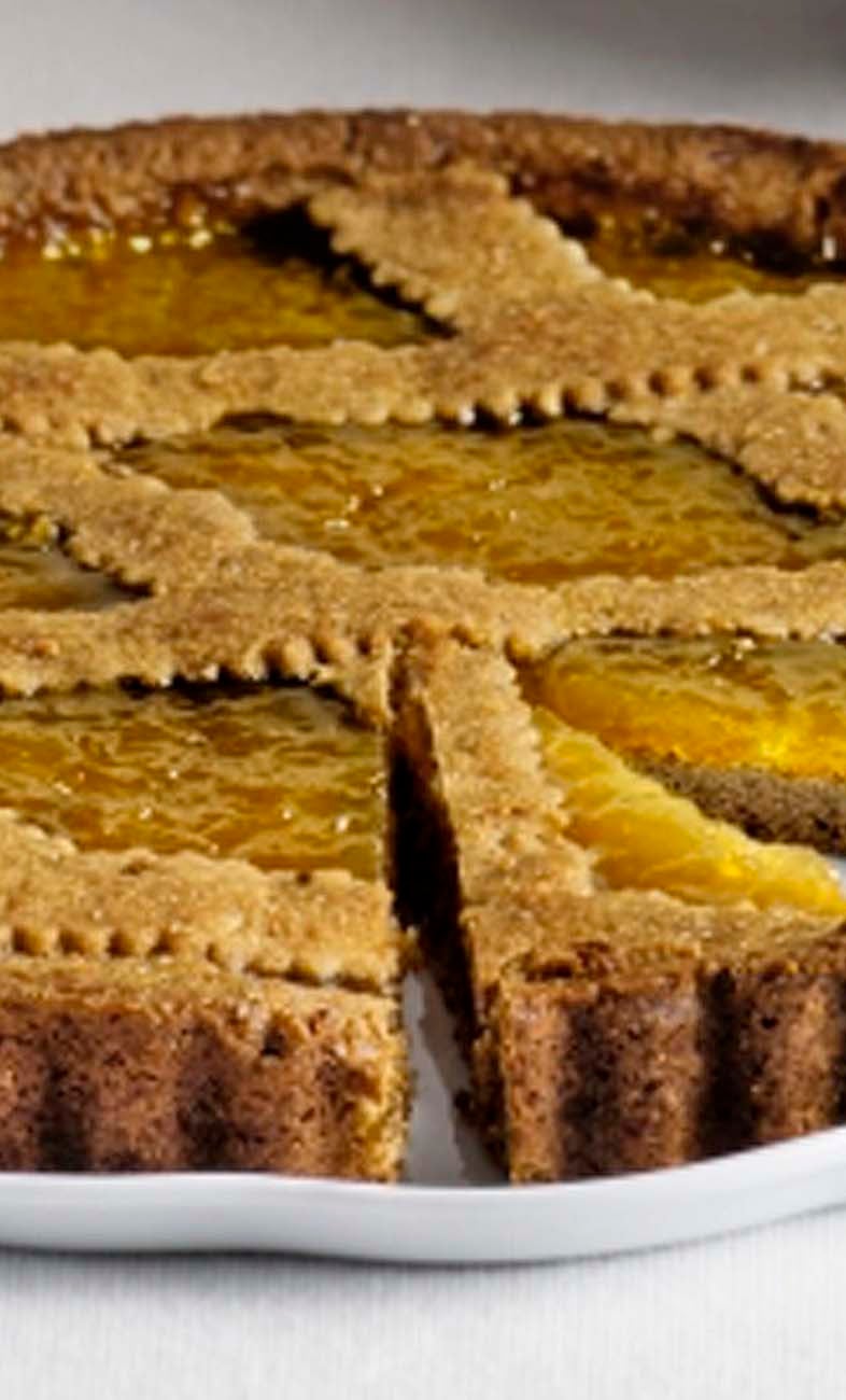 A multigrain tart shell filled with lemon and ginger marmelade. Vegan Certified.