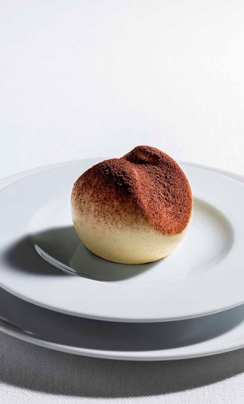 A tender coffee sponge base scented with citrus and cardamom topped with milk chocolate and coffee creams, finished with mascarpone cream.