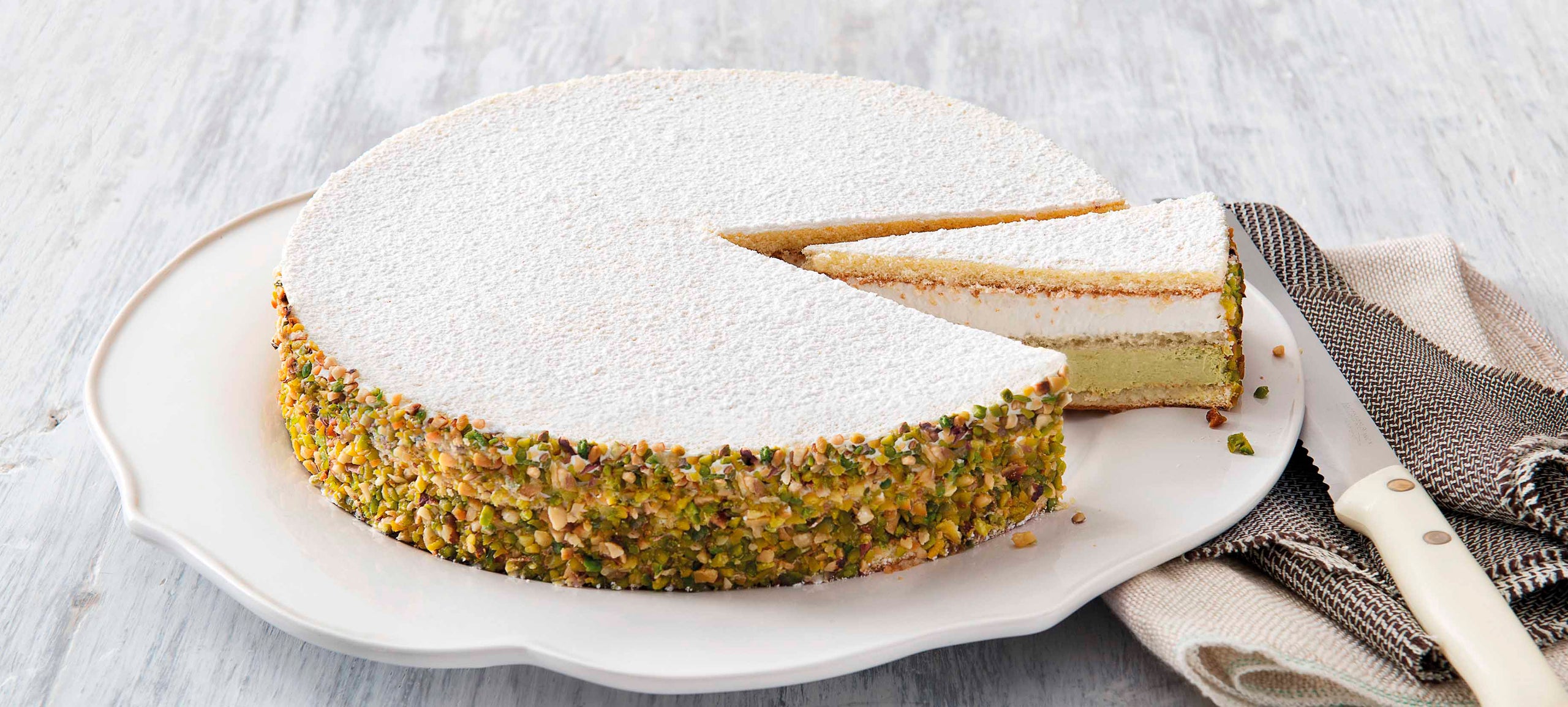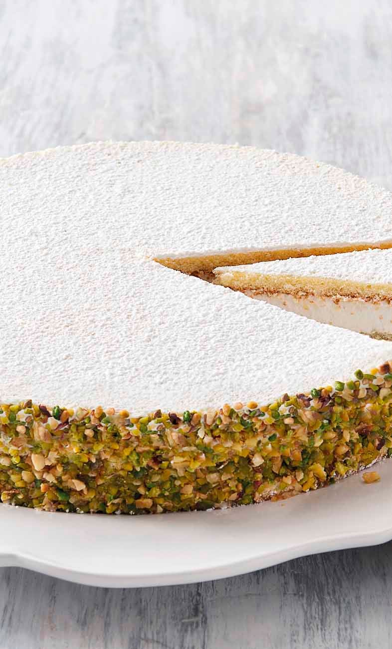 Crema di pistacchio e ricotta fra morbidi Pan di Spagna, decorata con granella di pistacchi e nocciole.