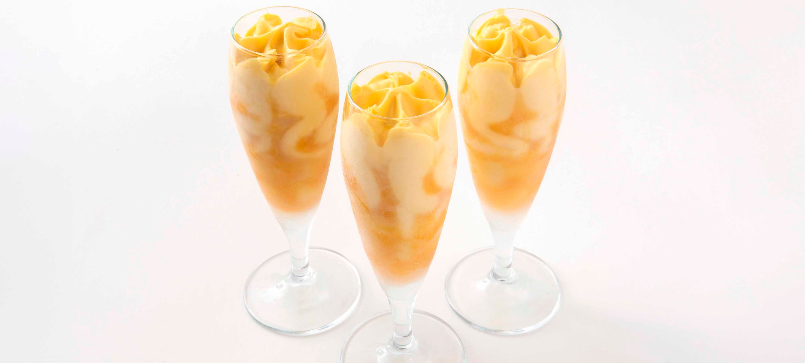 Gelato al mango con variegatura al frutto della passione. Il flute è in vetro.