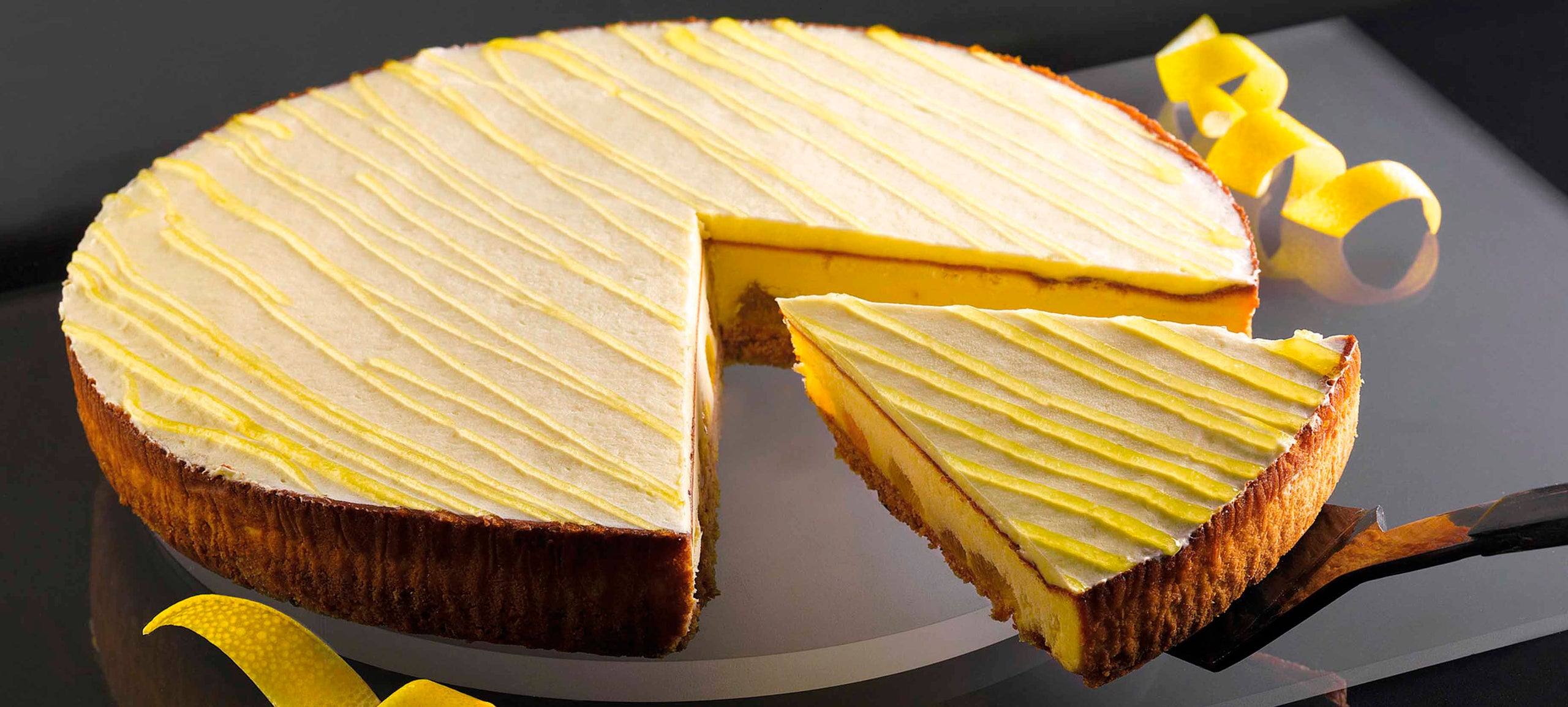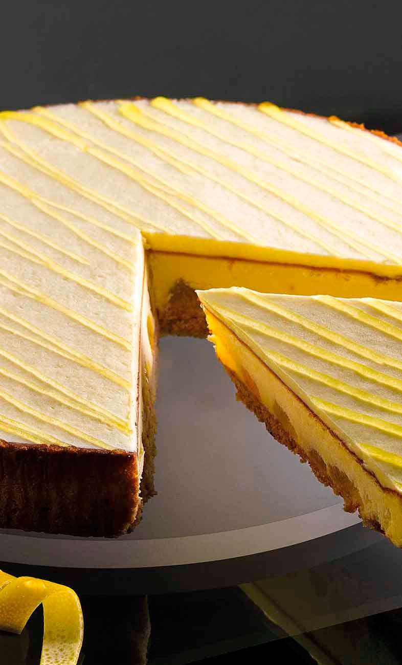 Crema di ricotta e mascarpone con crema al limoncello, decorata con variegatura di salsa al limone.
