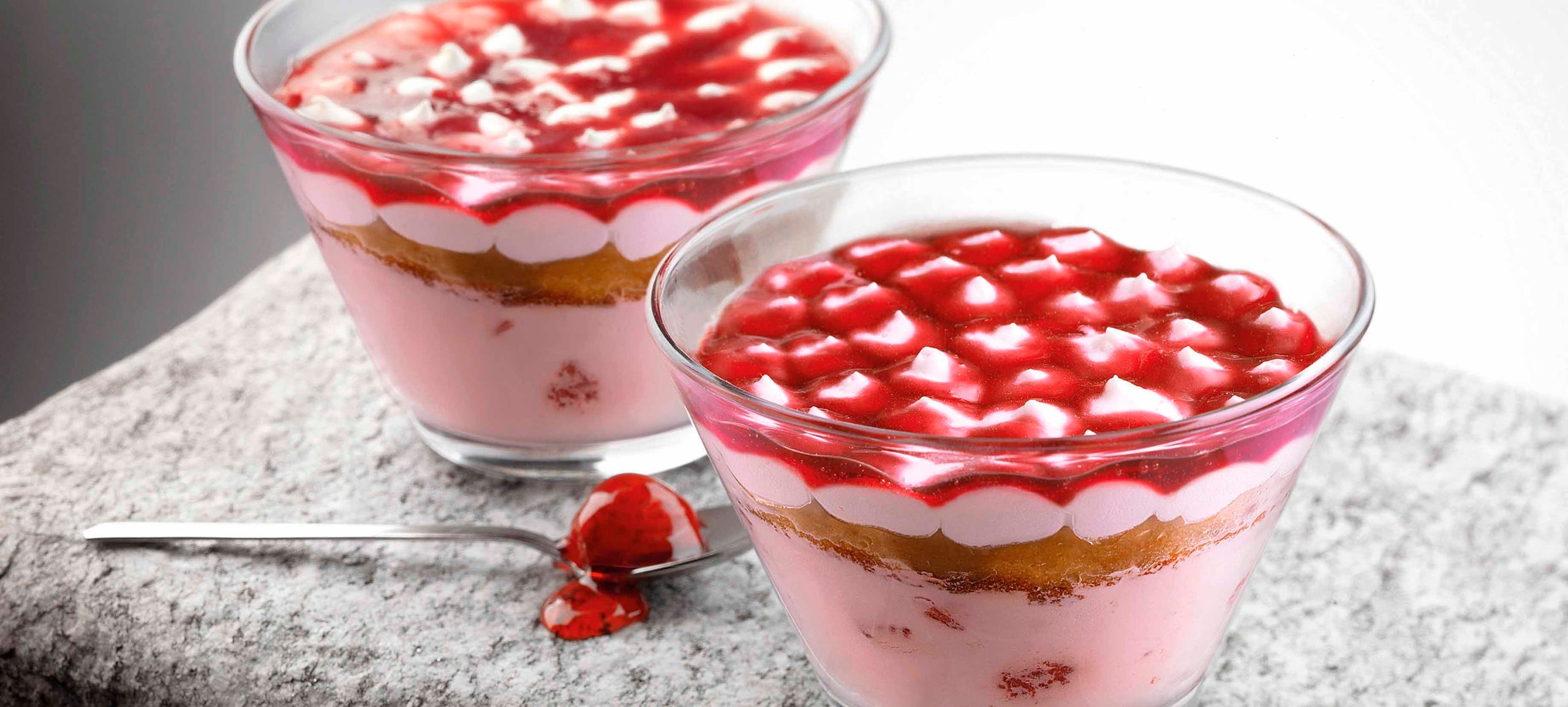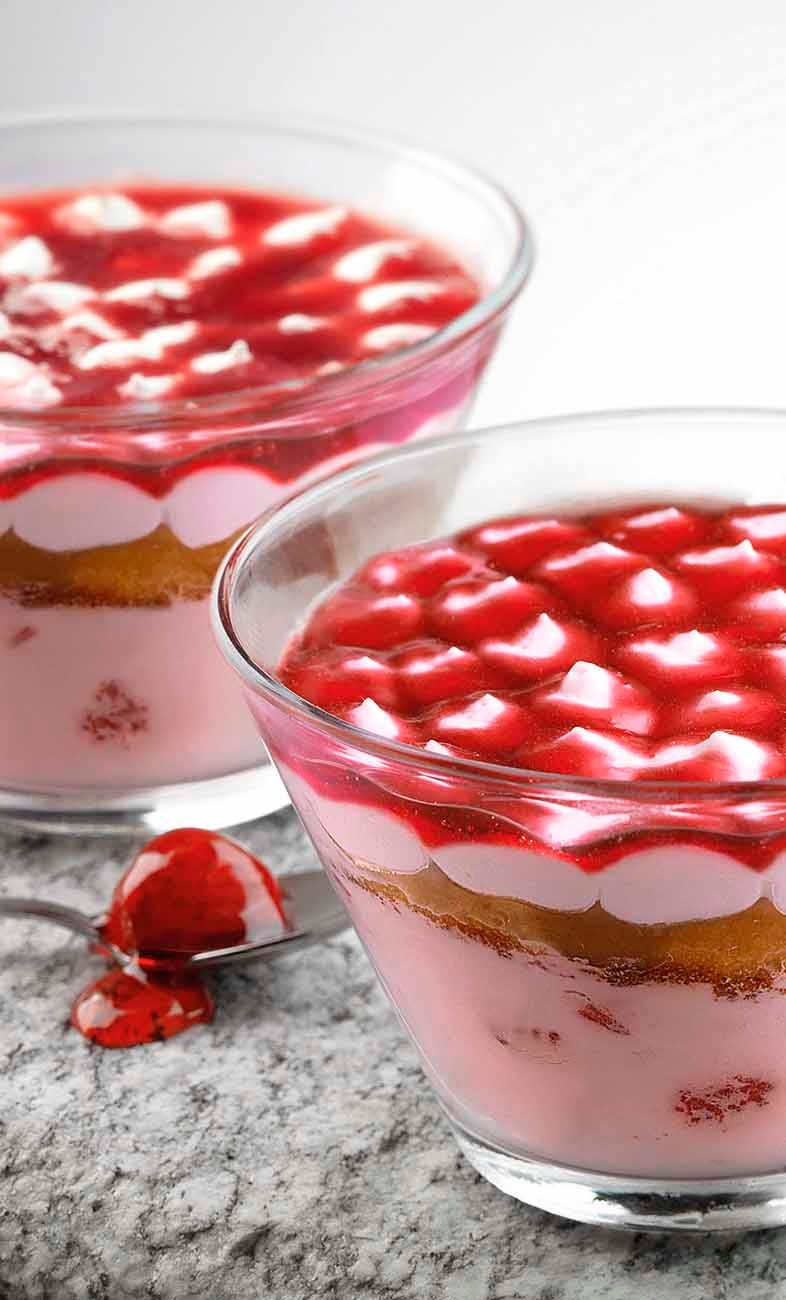 Gelato semifreddo con fragole candite e Pan di Spagna inzuppato al gusto di vaniglia e fragola. Coppa in vetro.