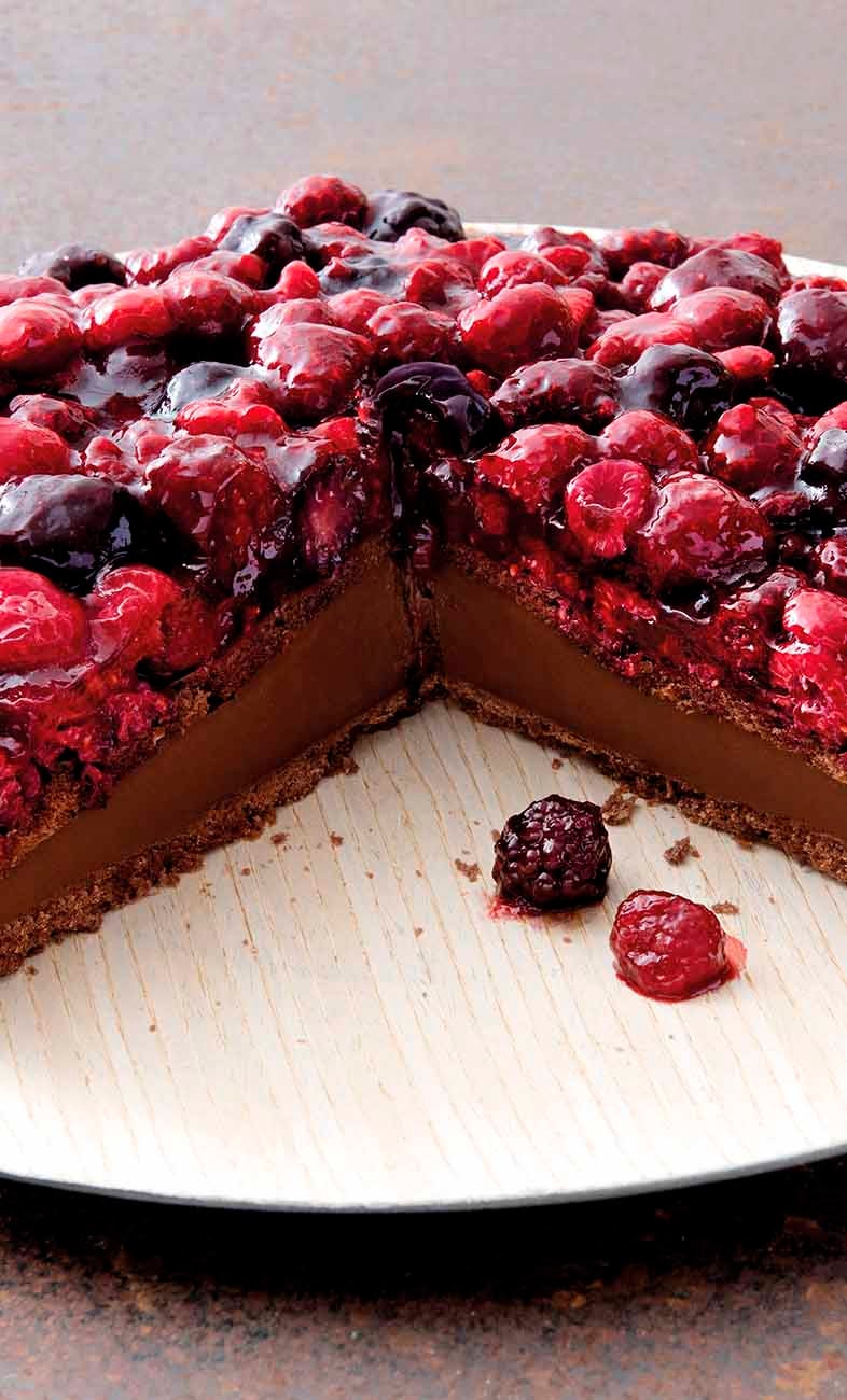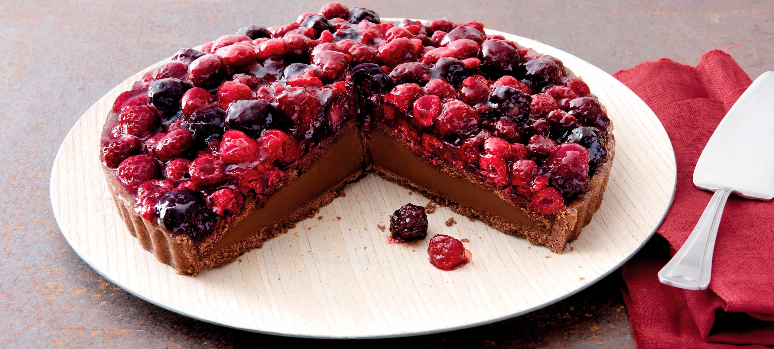 Innovativa base di pastafrolla al cacao e mandorle, farcita con una “ganache” al cioccolato fondente con pasta di cacao di Santo Domingo, decorata con more e lamponi.
