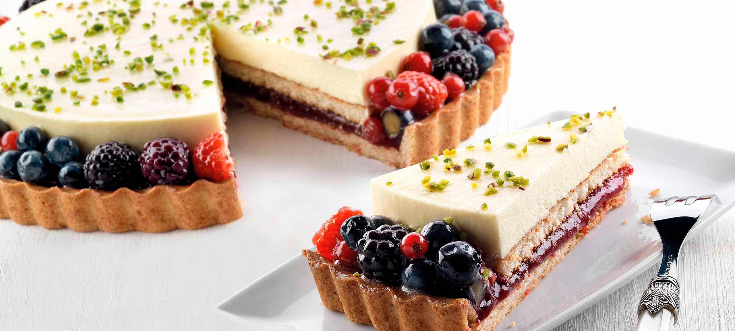 Pasta frolla con mousse al mascarpone e granella di pistacchio con frutti di bosco