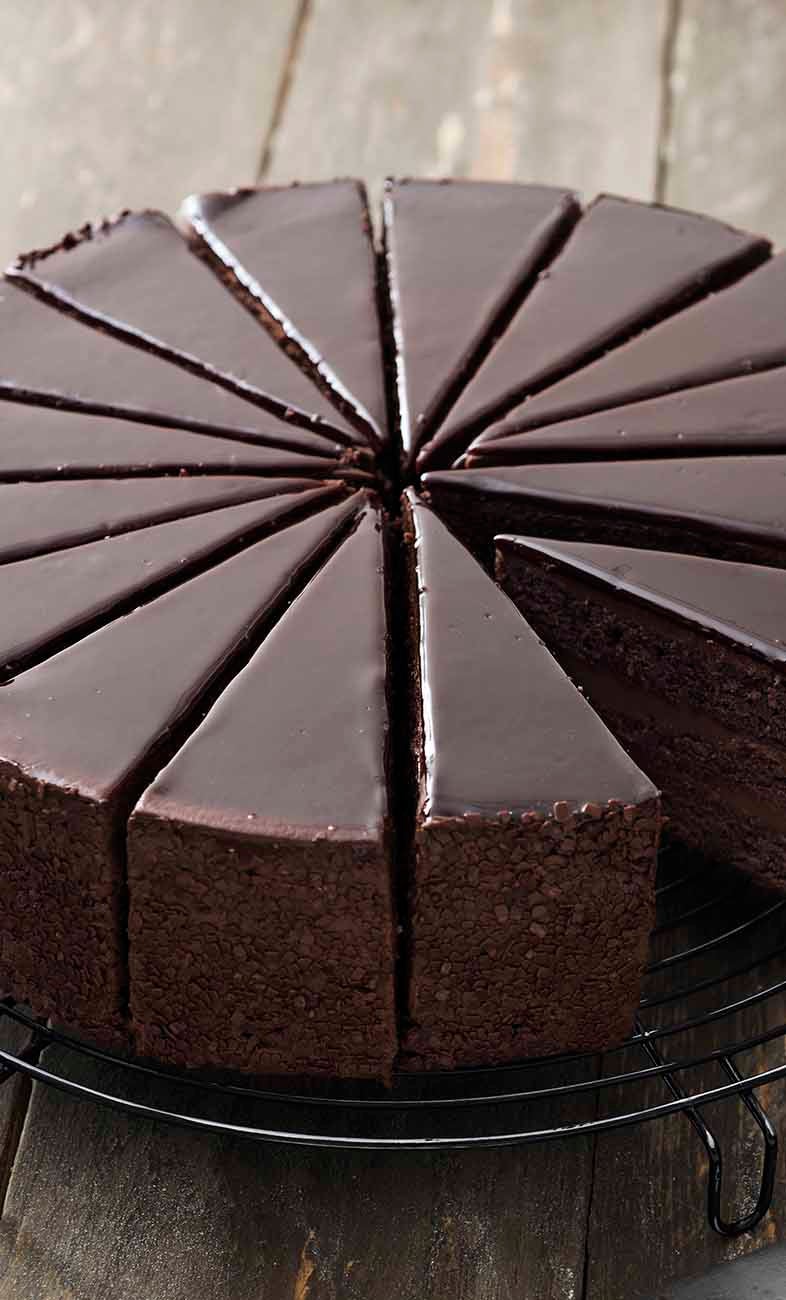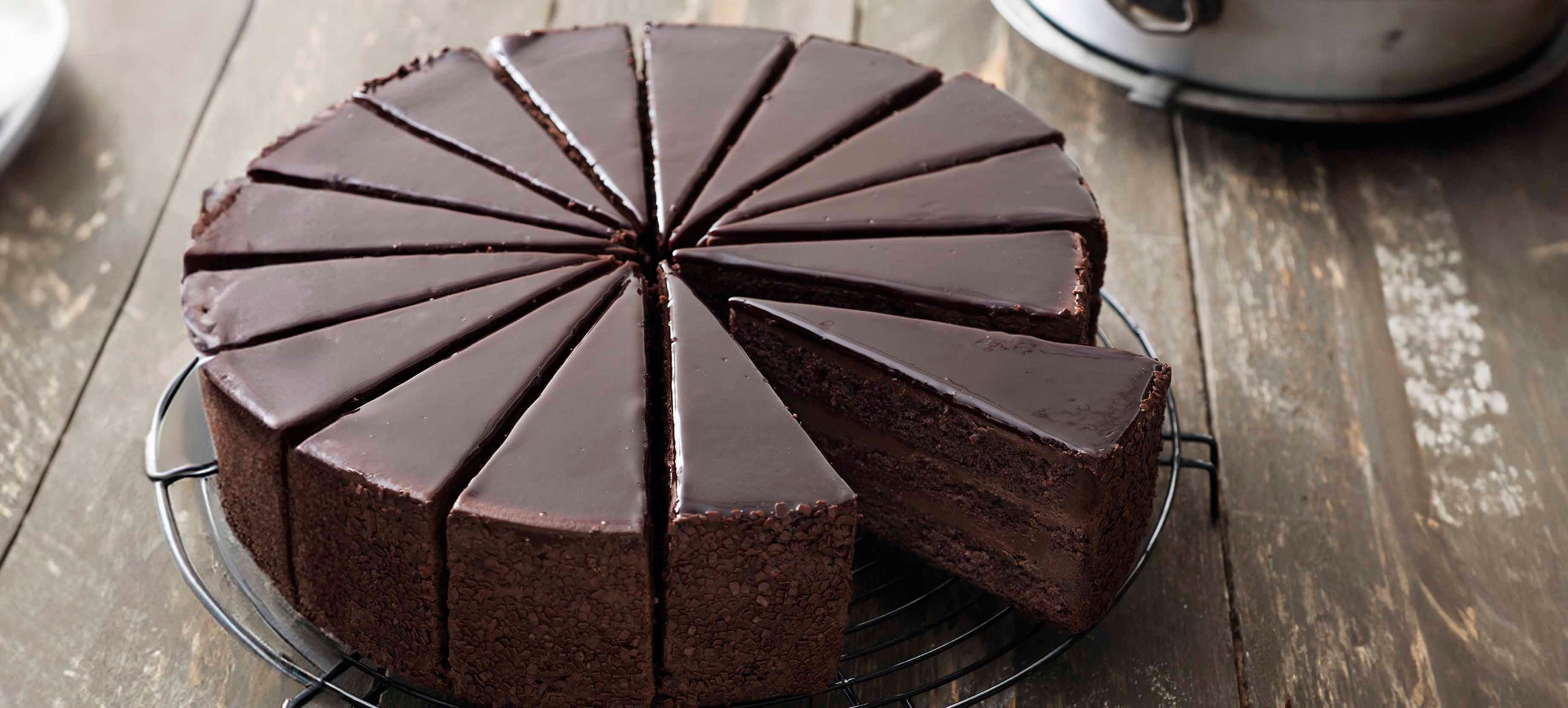 Pan di Spagna al cacao, farciti con crema al cioccolato fondente con pasta di cacao di Santo Domingo, decorato con scaglie di cioccolato. Torta pretagliata.