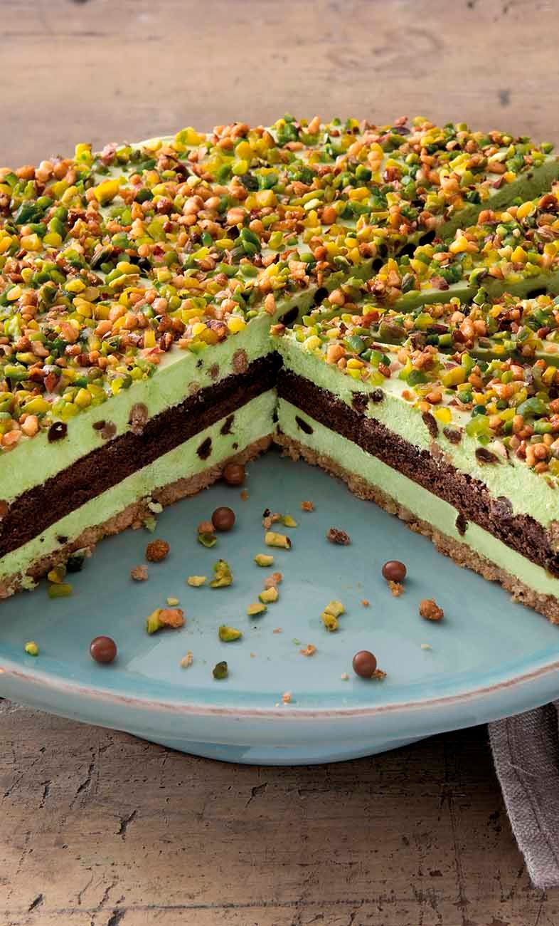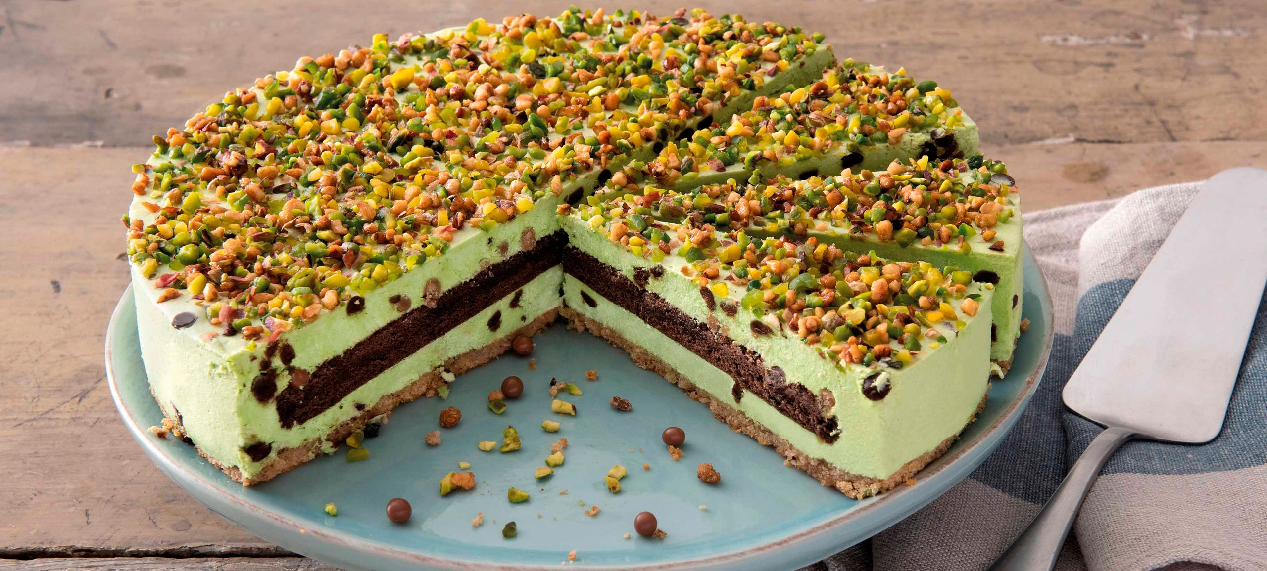 Biscotto alla nocciola farcito con crema al pistacchio e gocce di cioccolato, decorato con granella di pistacchio e di nocciole pralinate.