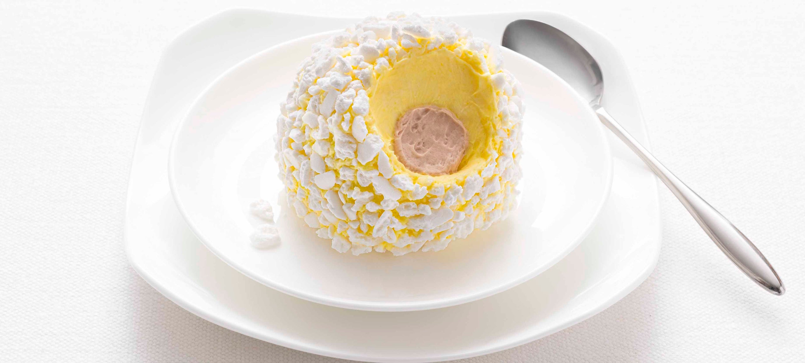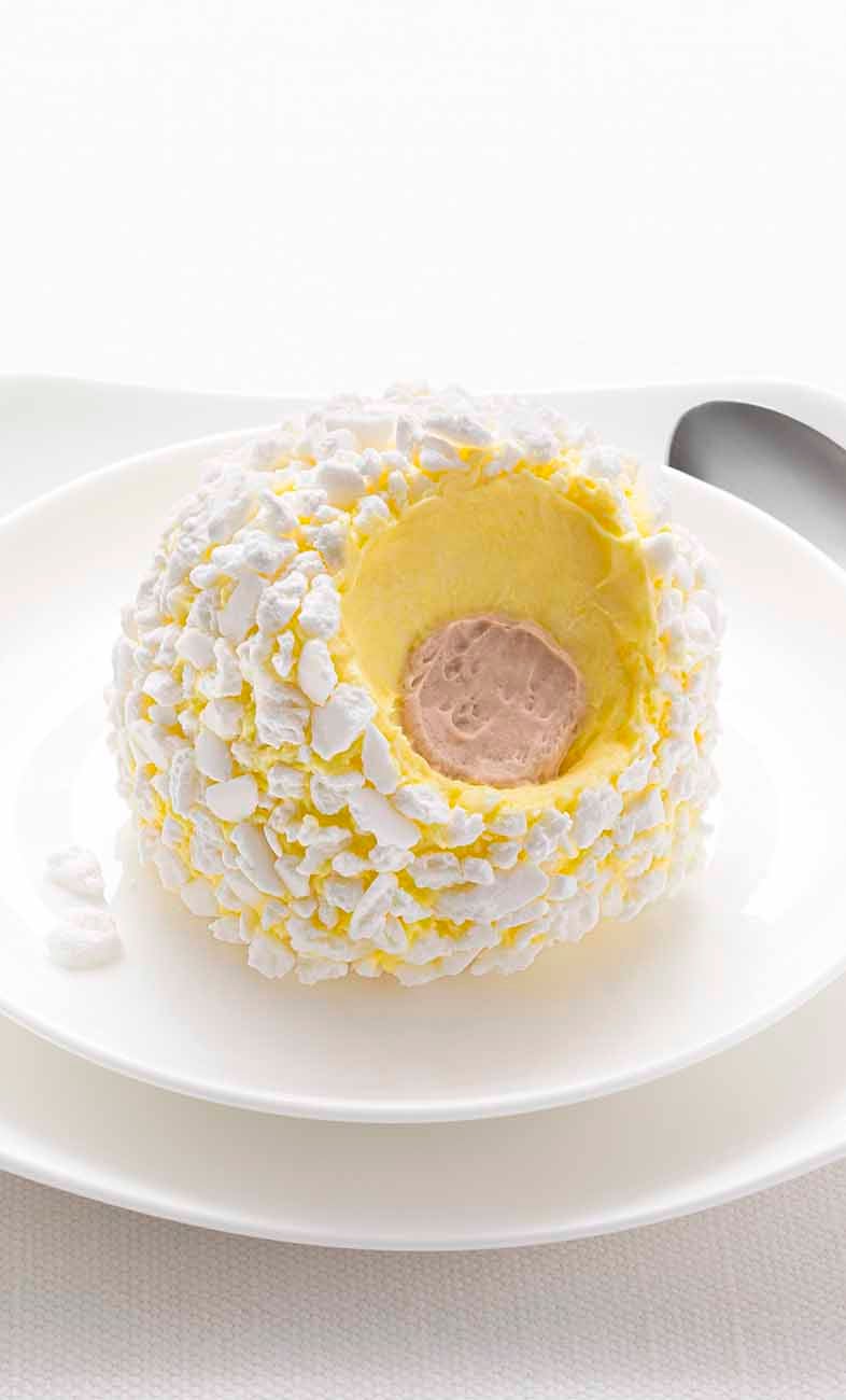Gelato semifreddo allo zabaione con cuore di gelato al caffé decorato con granella di meringa