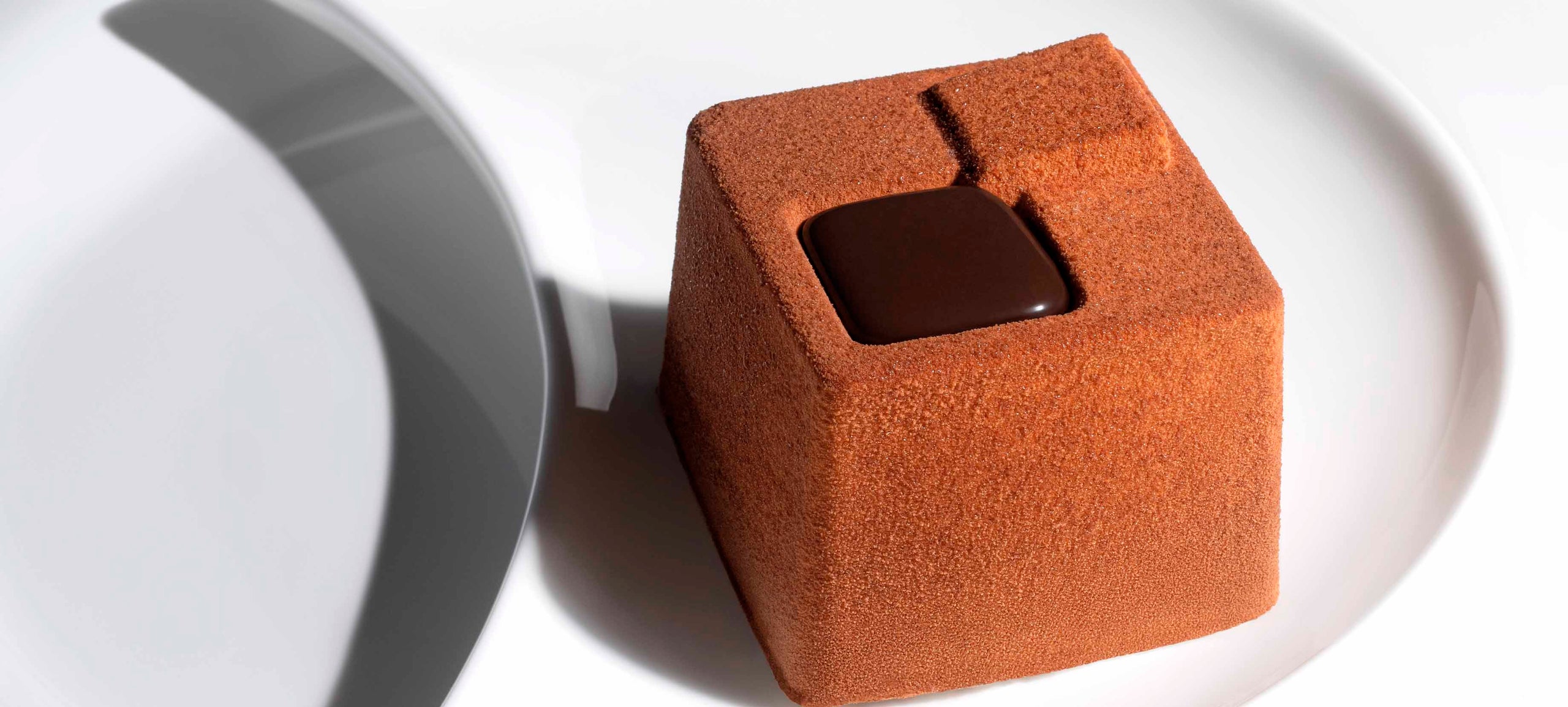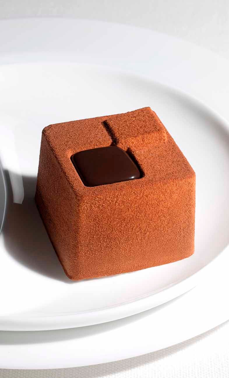 Crema con panna fresca e cioccolato bianco, arricchito da uno strato di crunch alla nocciola, su base di pan di Spagna. Ricoperto da un velo al cioccolato fondente con pasta di cacao di Santo Domingo.