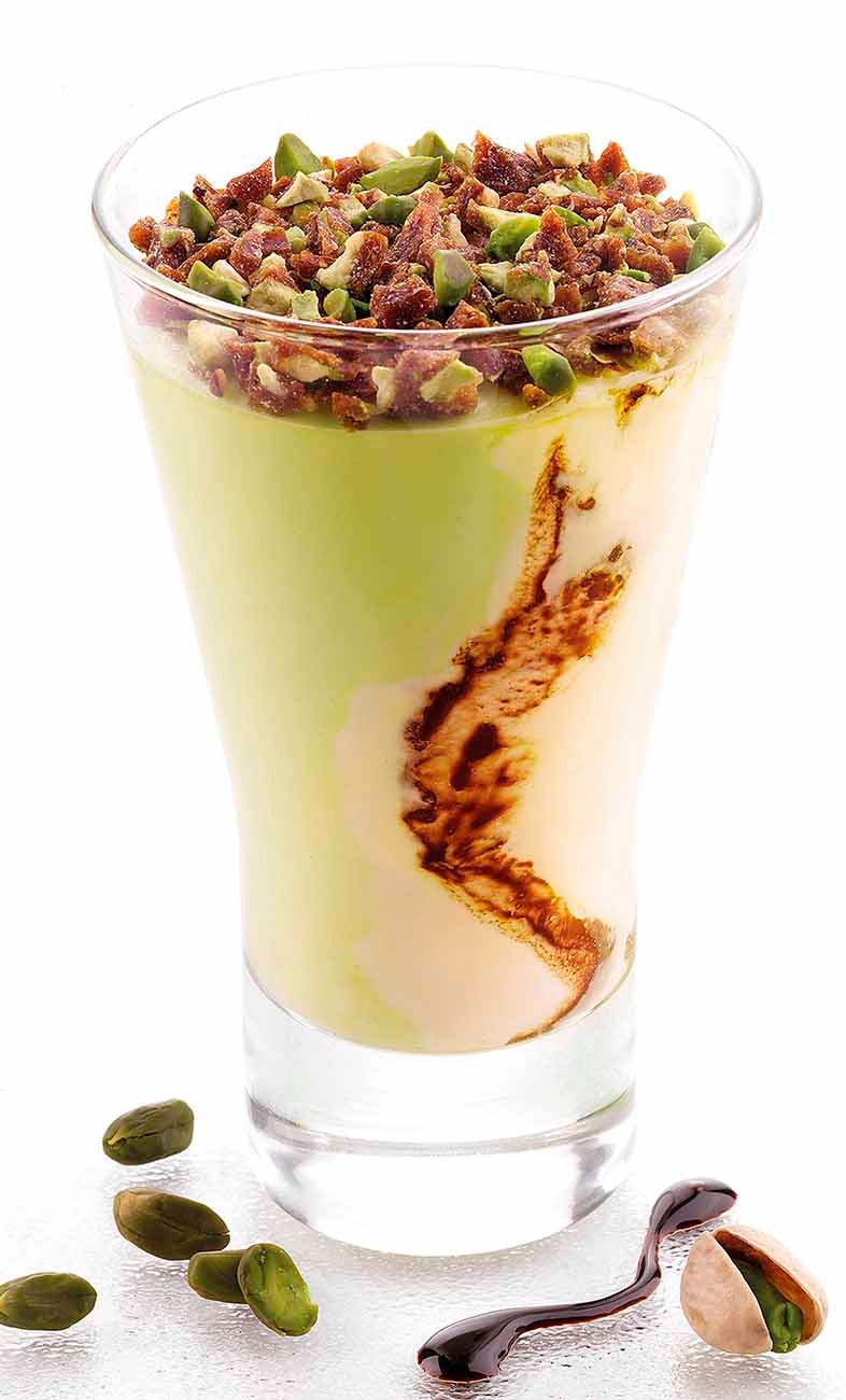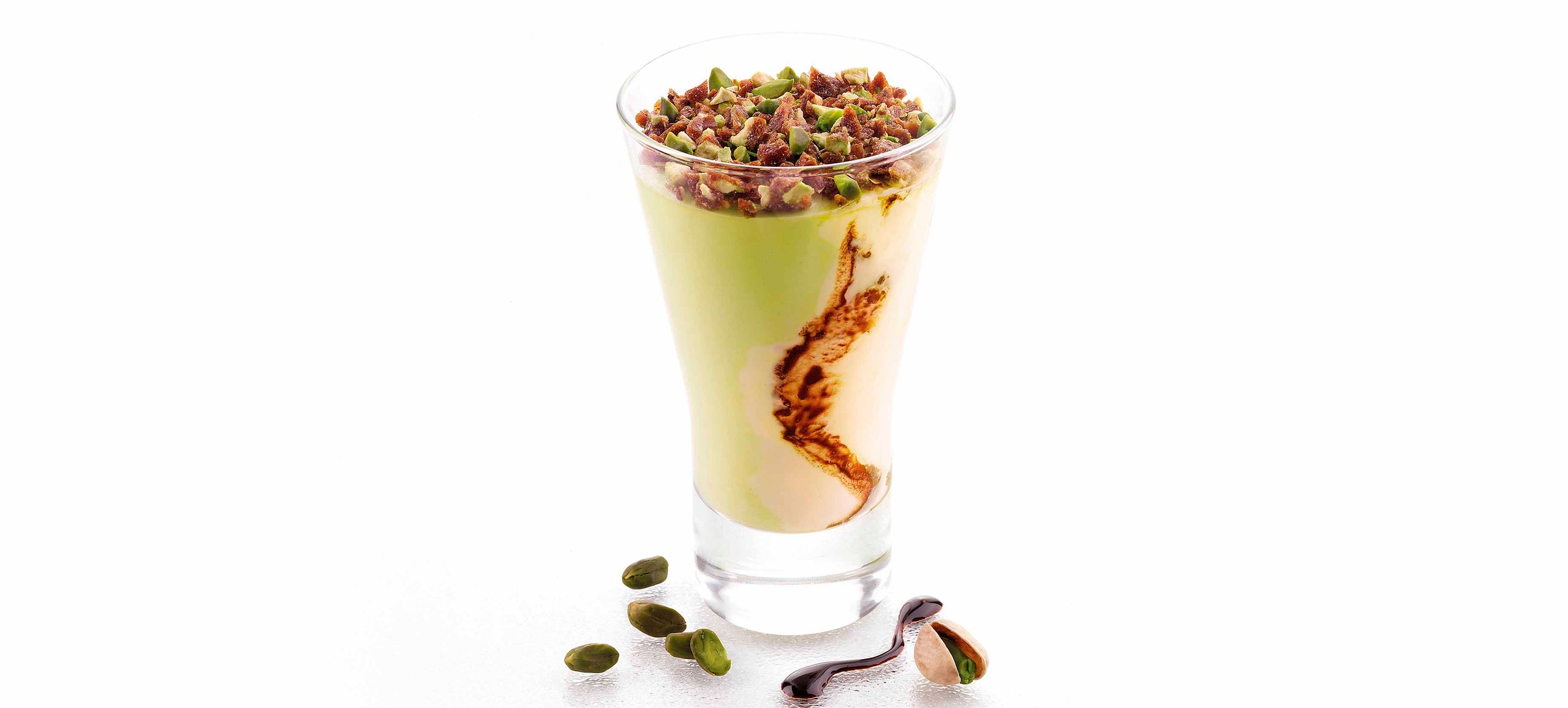 Coppa gelato alla crema e al pistacchio variegato al cioccolato, decorata con pistacchi pralinati. La coppa è in vetro.