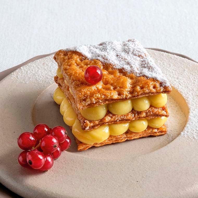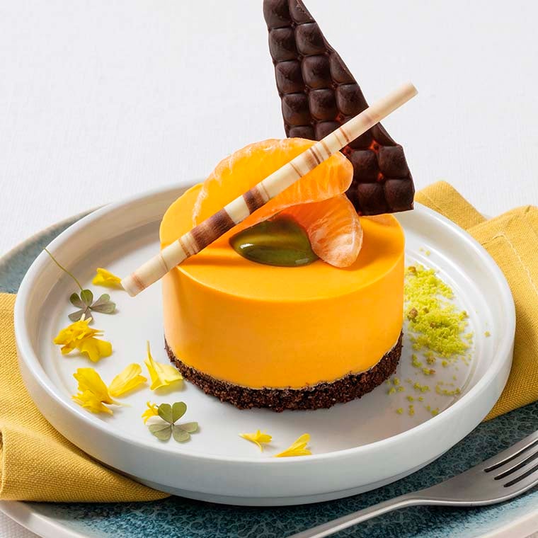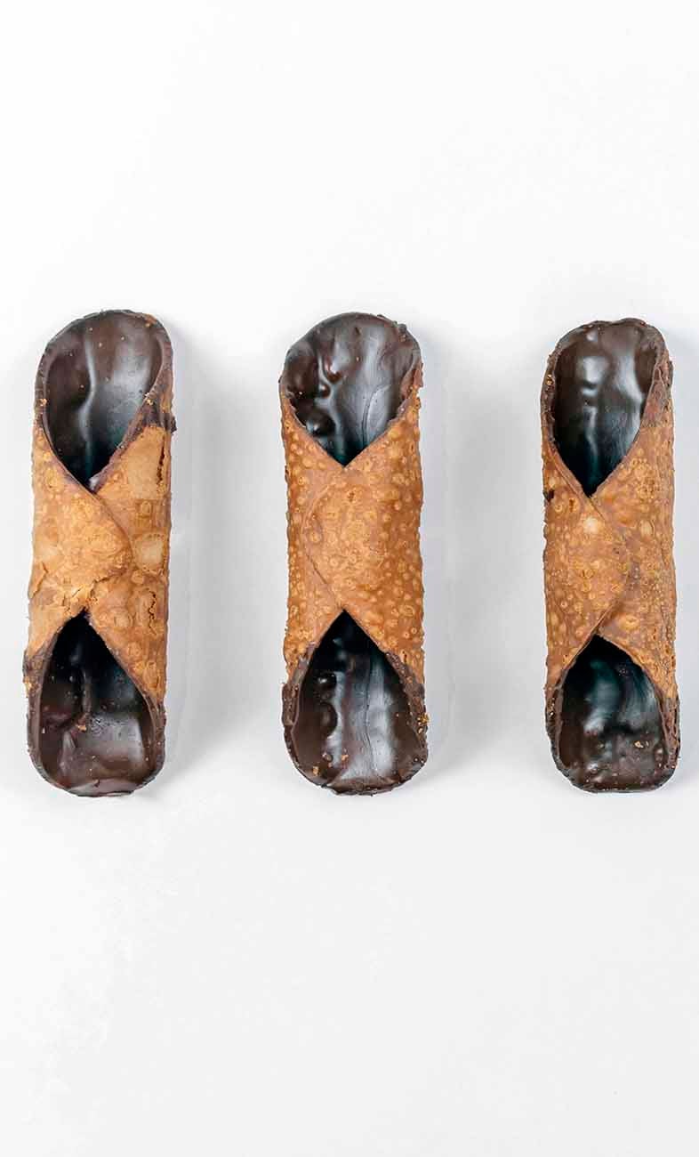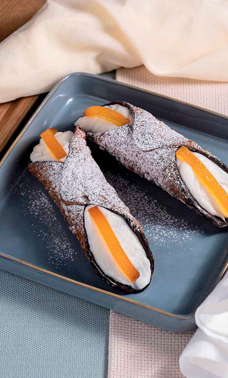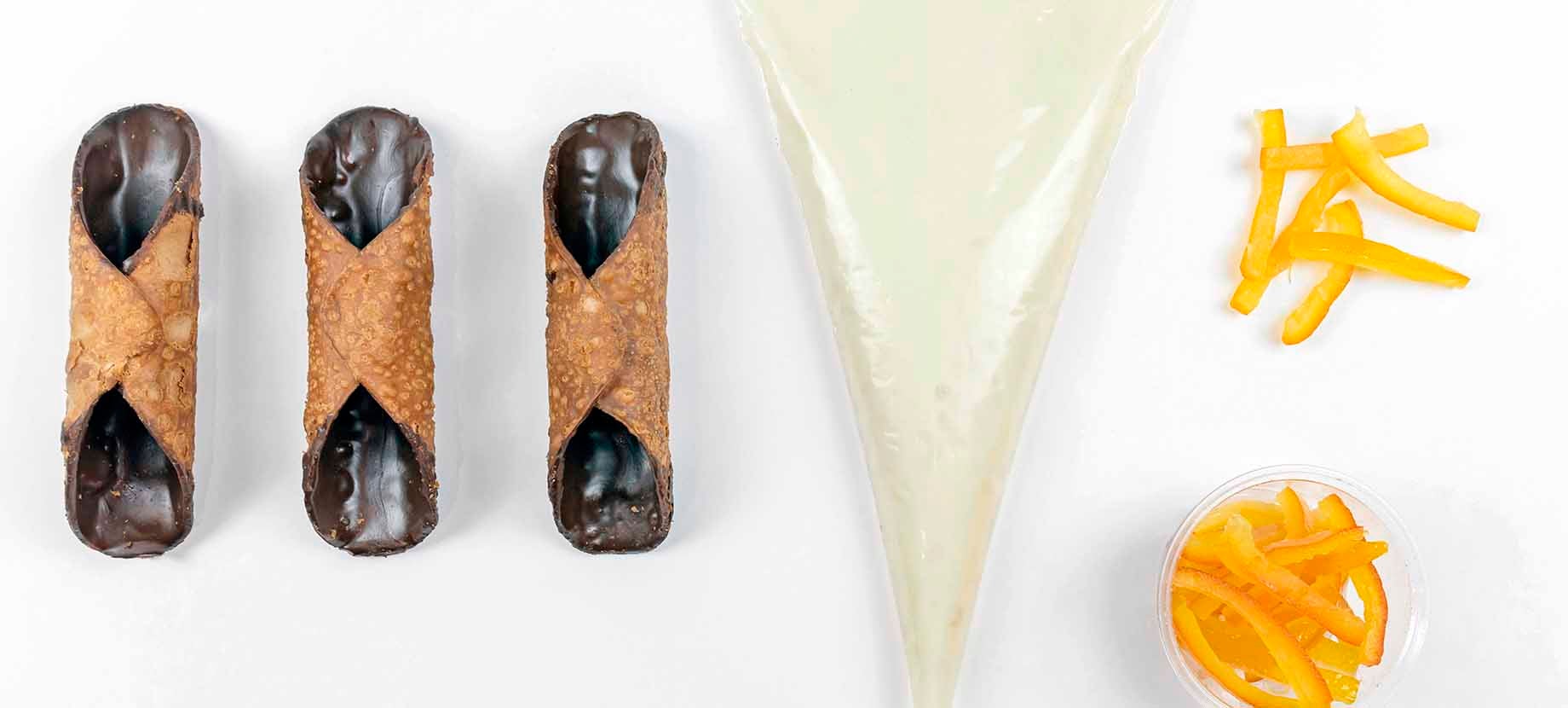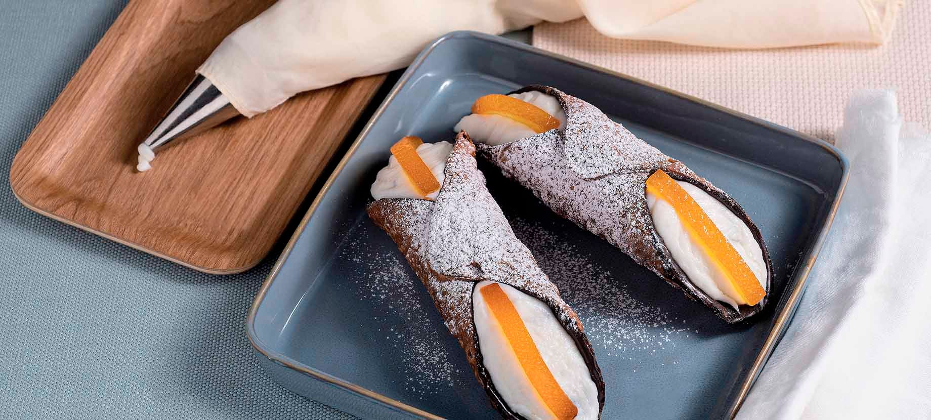 Tipica cialda al cacao, crema alla ricotta e scorze d’arancia candite.
