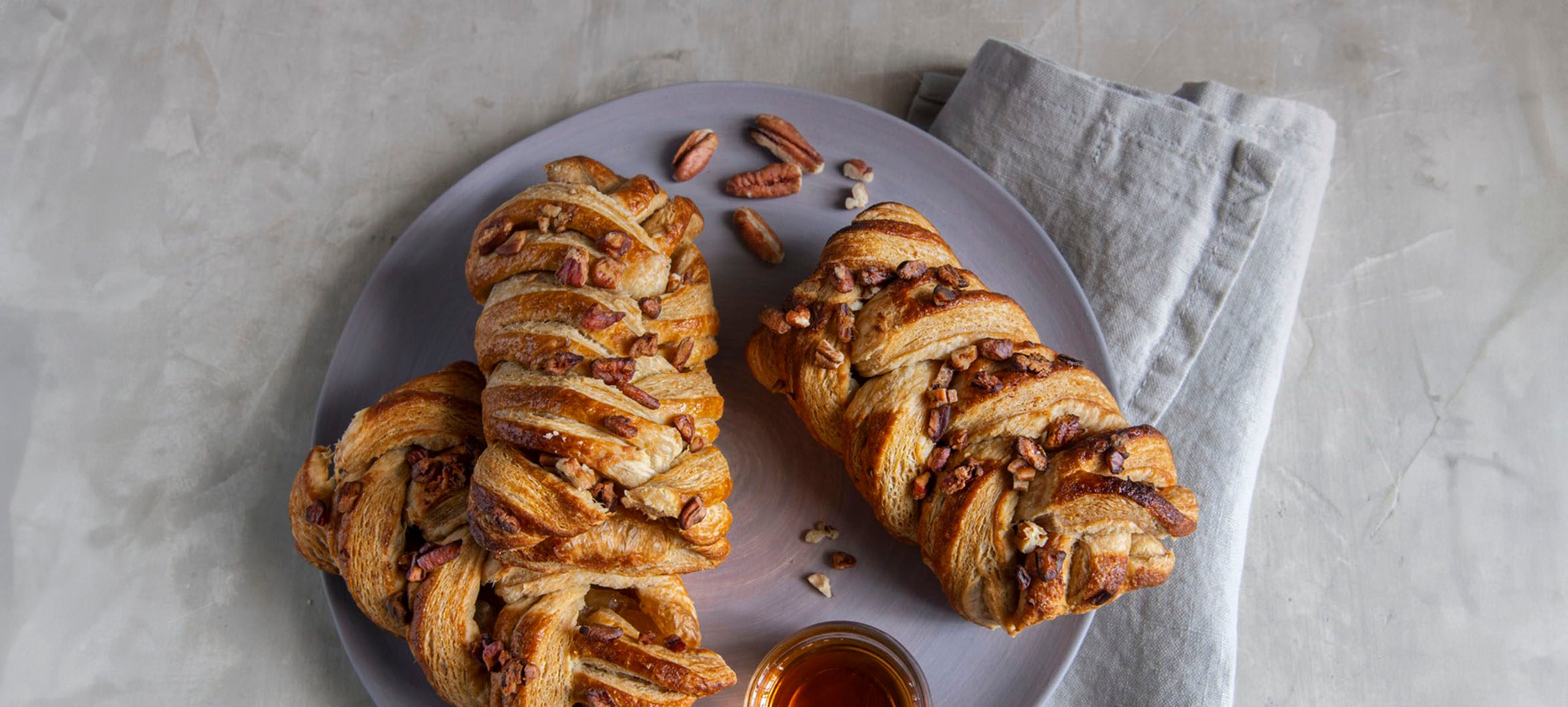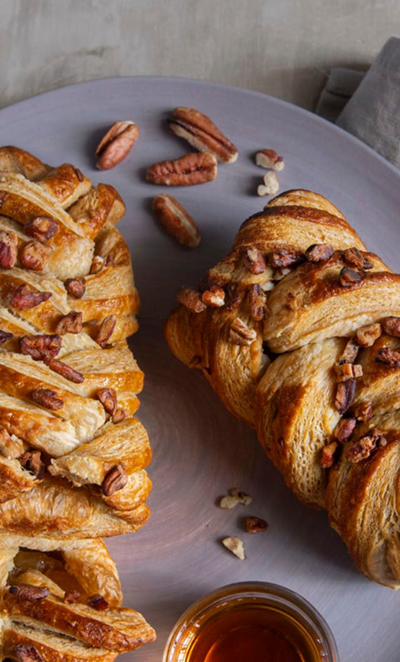 Fragrante intreccio con lievito naturale e riposo dell’impasto come nel metodo artigianale. Farcito con sciroppo d’acero e decorato con la migliore selezione di noci pecan.