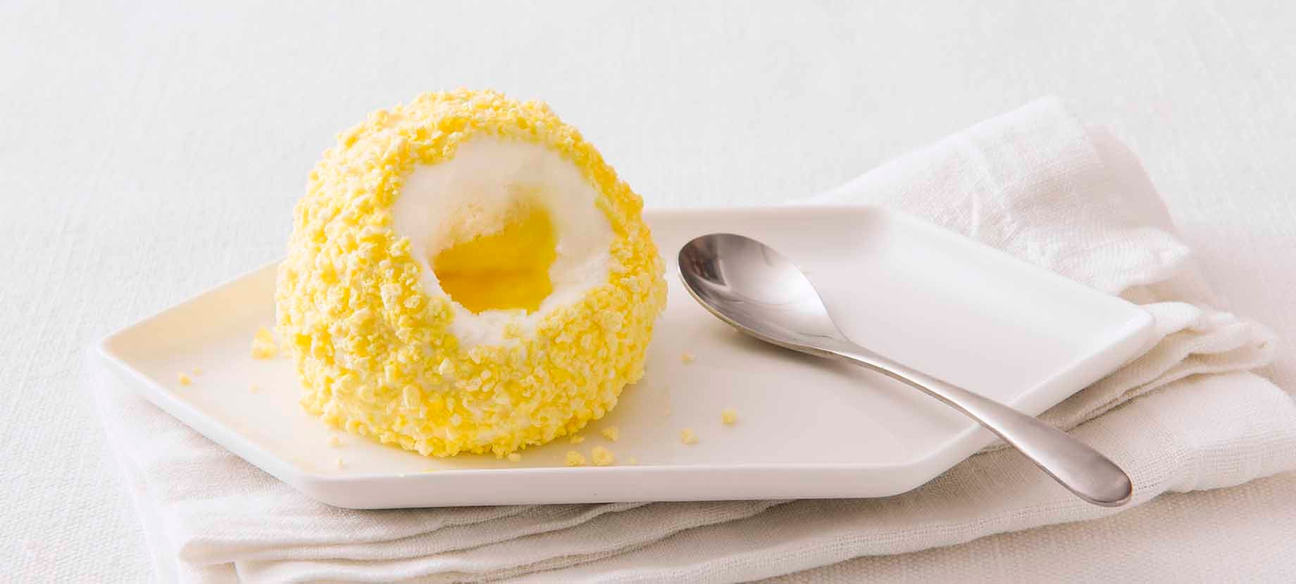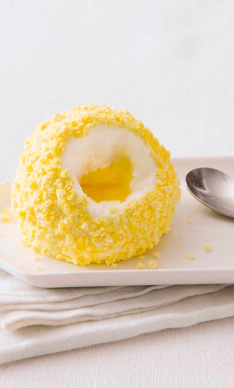 Gelato semifreddo al limone con cuore liquido al limoncello, decorato con granella di meringa. Utilizziamo solo limoni italiani