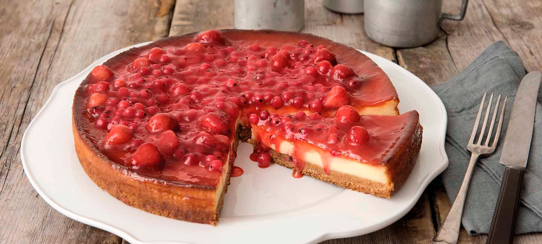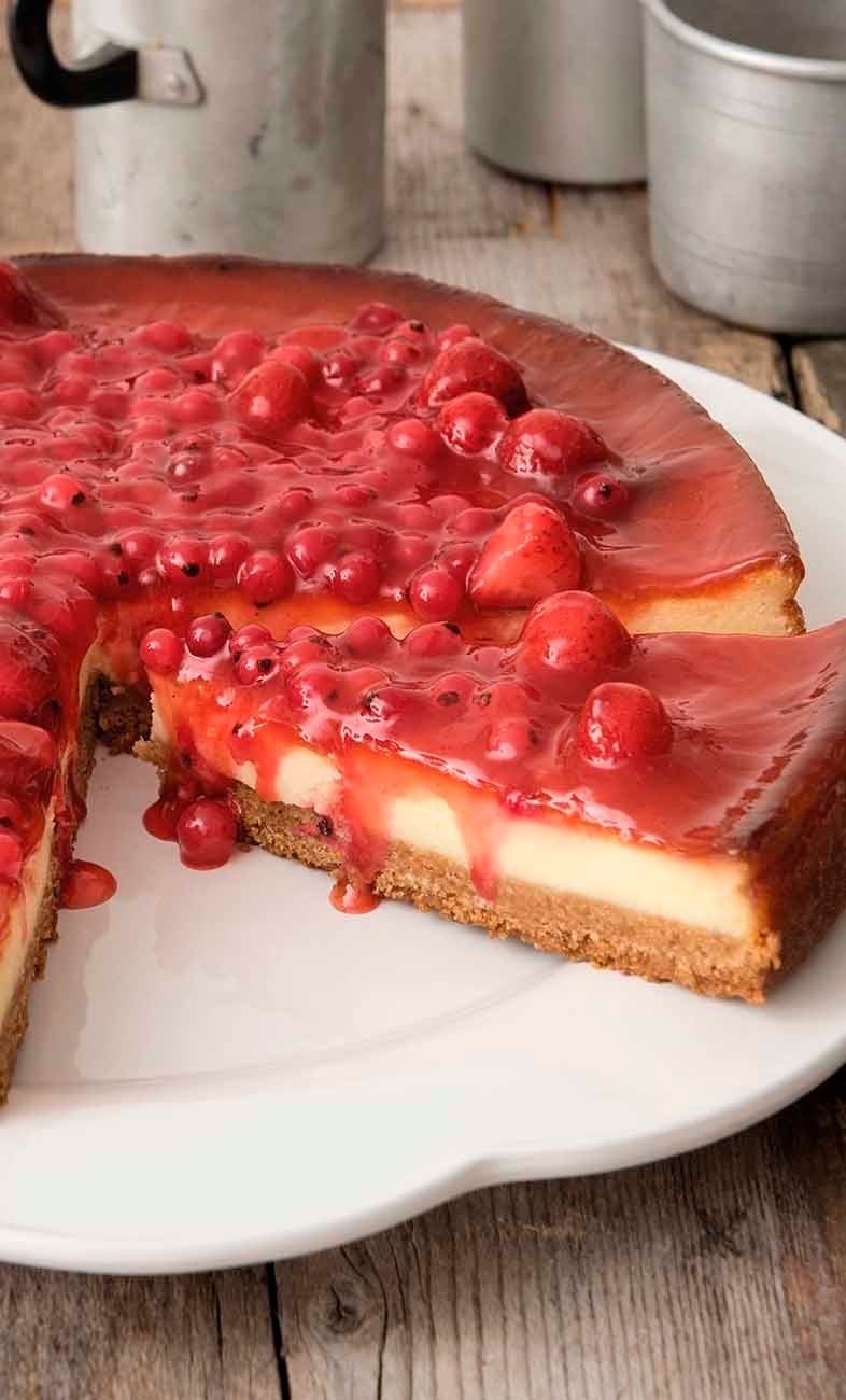 Torta di ricotta e formaggio cremoso su base di biscotto con fragoline e ribes