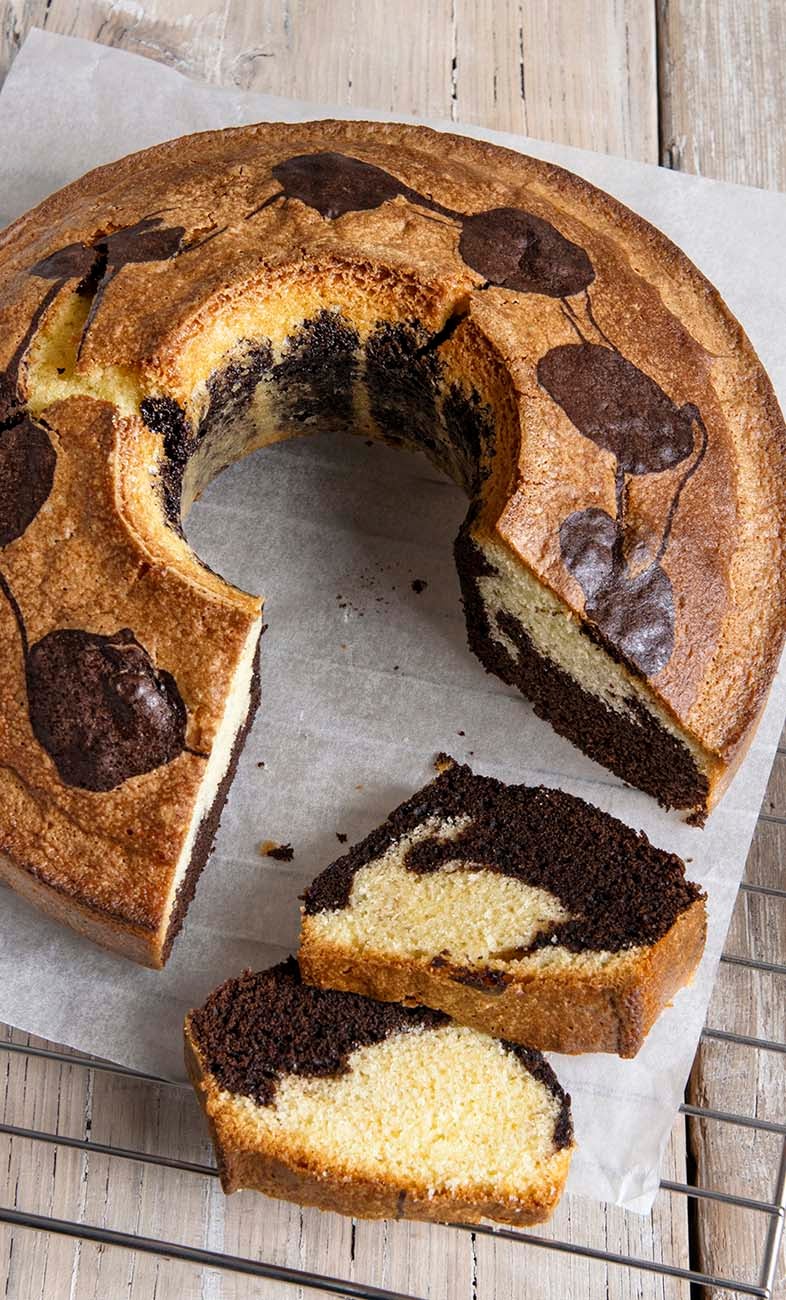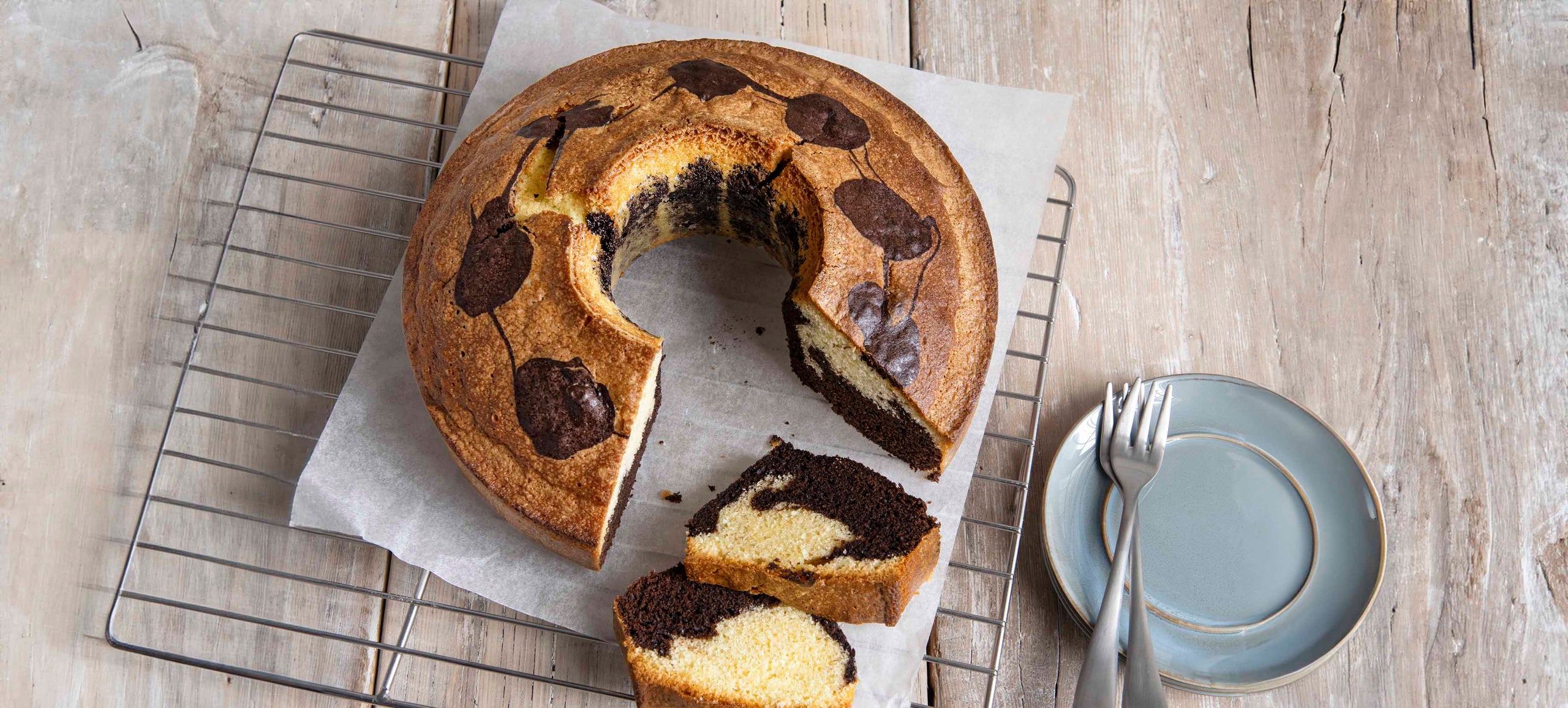 Un ciambellone soffice e goloso, con un impasto marmorizzato a due colori. Un connubio delizioso tra cacao e yogurt. Adatto per tutte le occasioni di consumo.