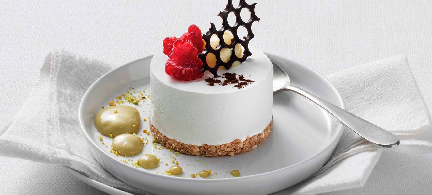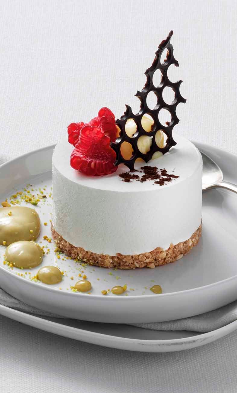 Classica ricetta del Cheesecake di pasticceria con crema al formaggio e base di biscotto, che darà allo chef l’ispirazione e la creatività nella decorazione e nell’impiattamento.