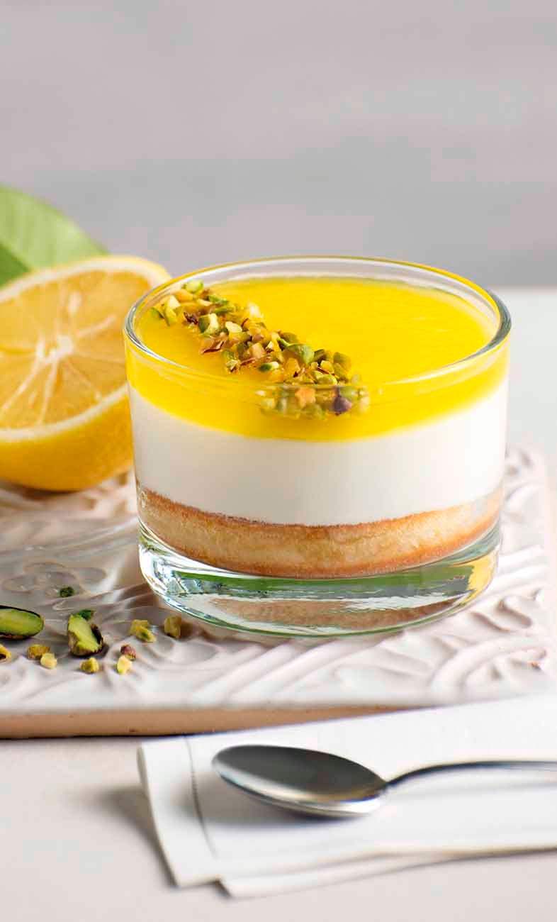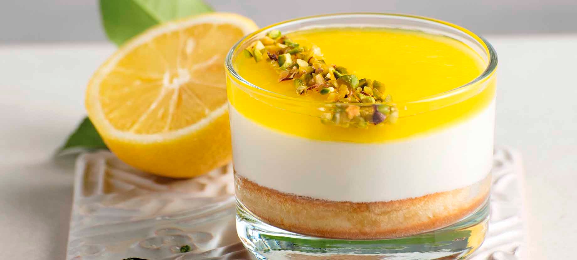 Pan di Spagna con inzuppatura al succo di “Limone di Sorrento IGP”, crema al gusto vaniglia con salsa al succo di “Limone di Sorrento IGP” decorata con granella di pistacchi.