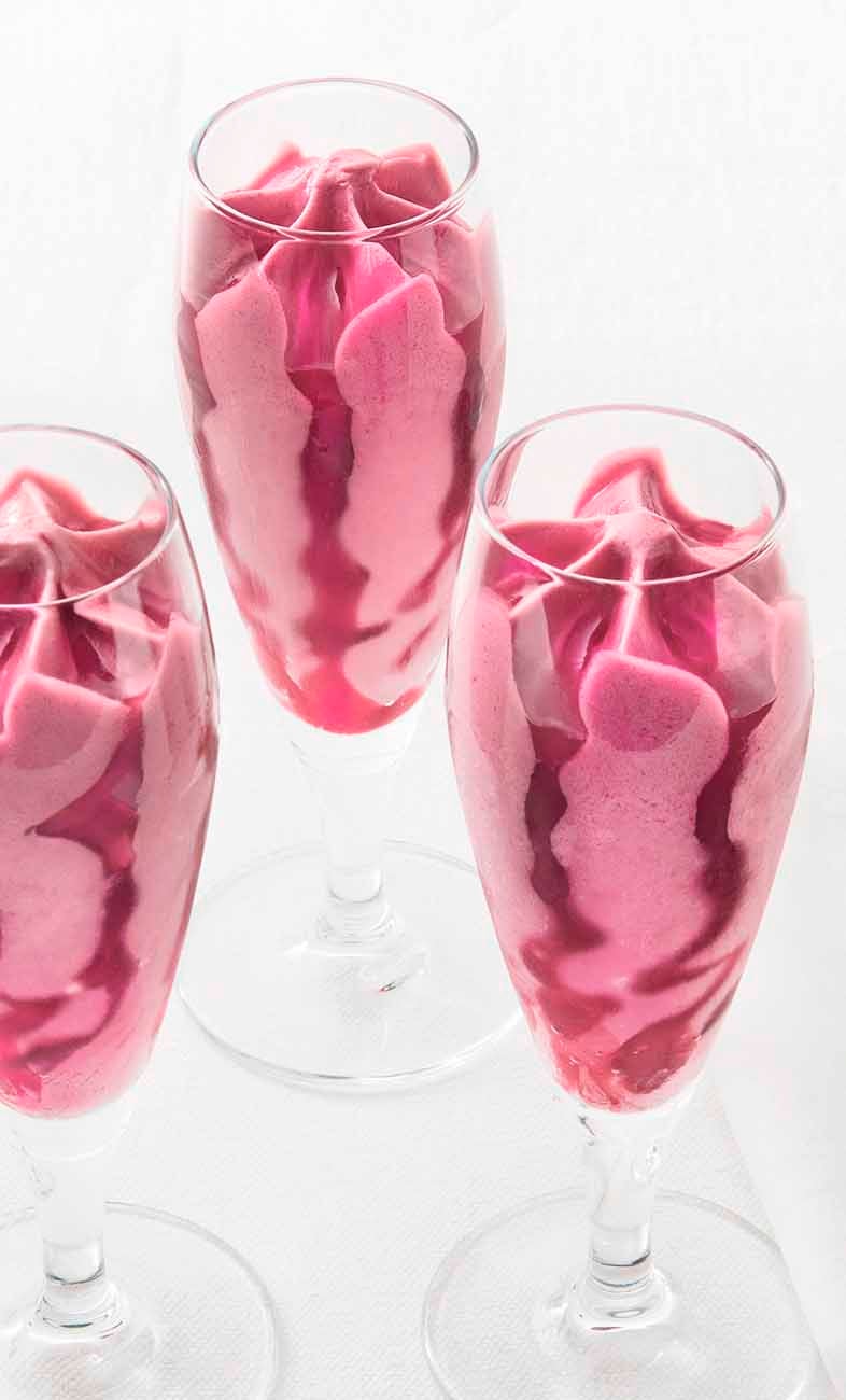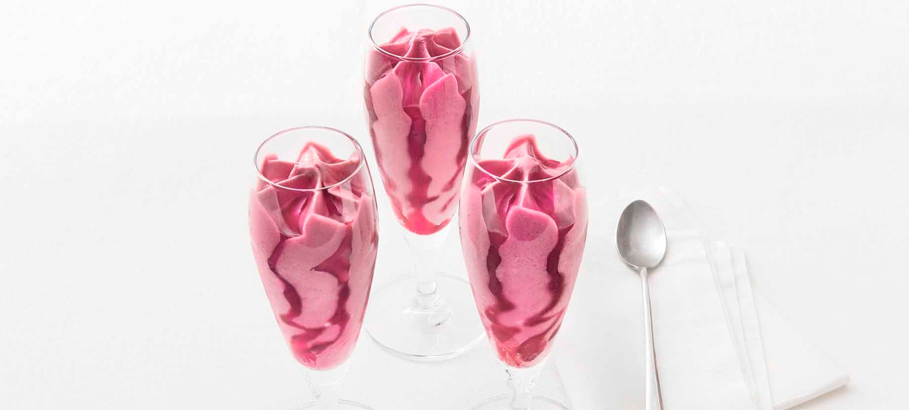Gelato ai frutti di bosco con succo di lime e variegatura al lampone. Il flute è in vetro.