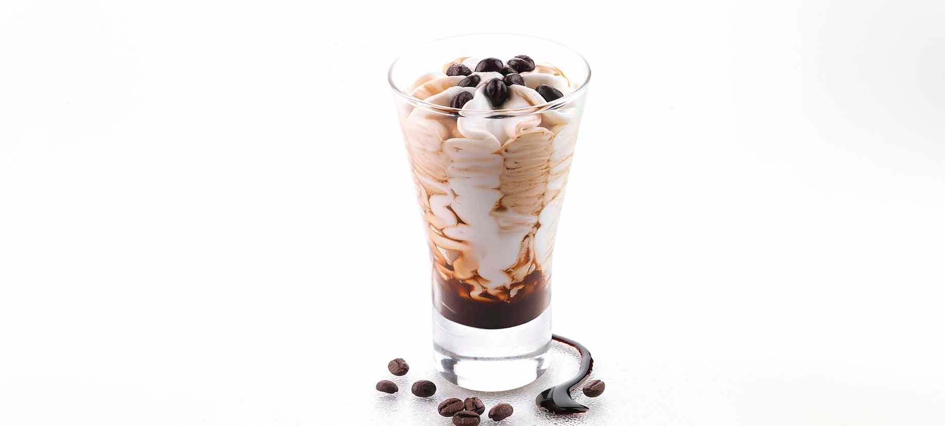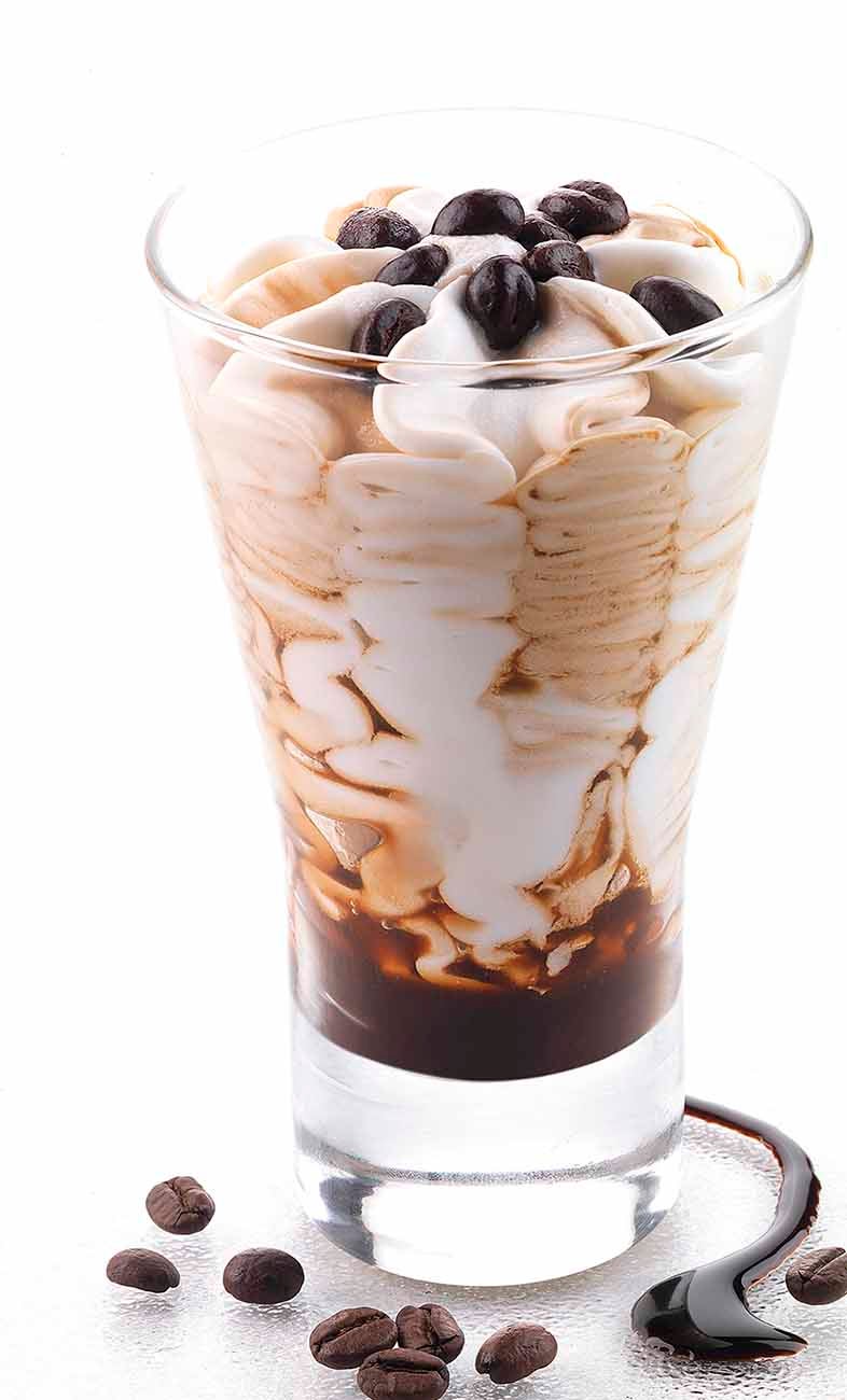 Coppa gelato alla panna variegata al caffè. Decorata con chicchi di cioccolato al caffè. La coppa è in vetro.