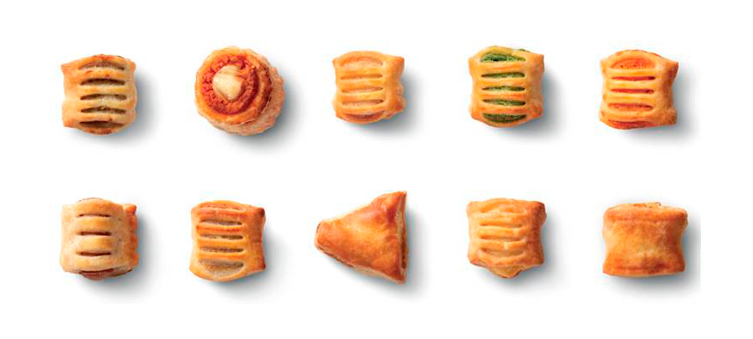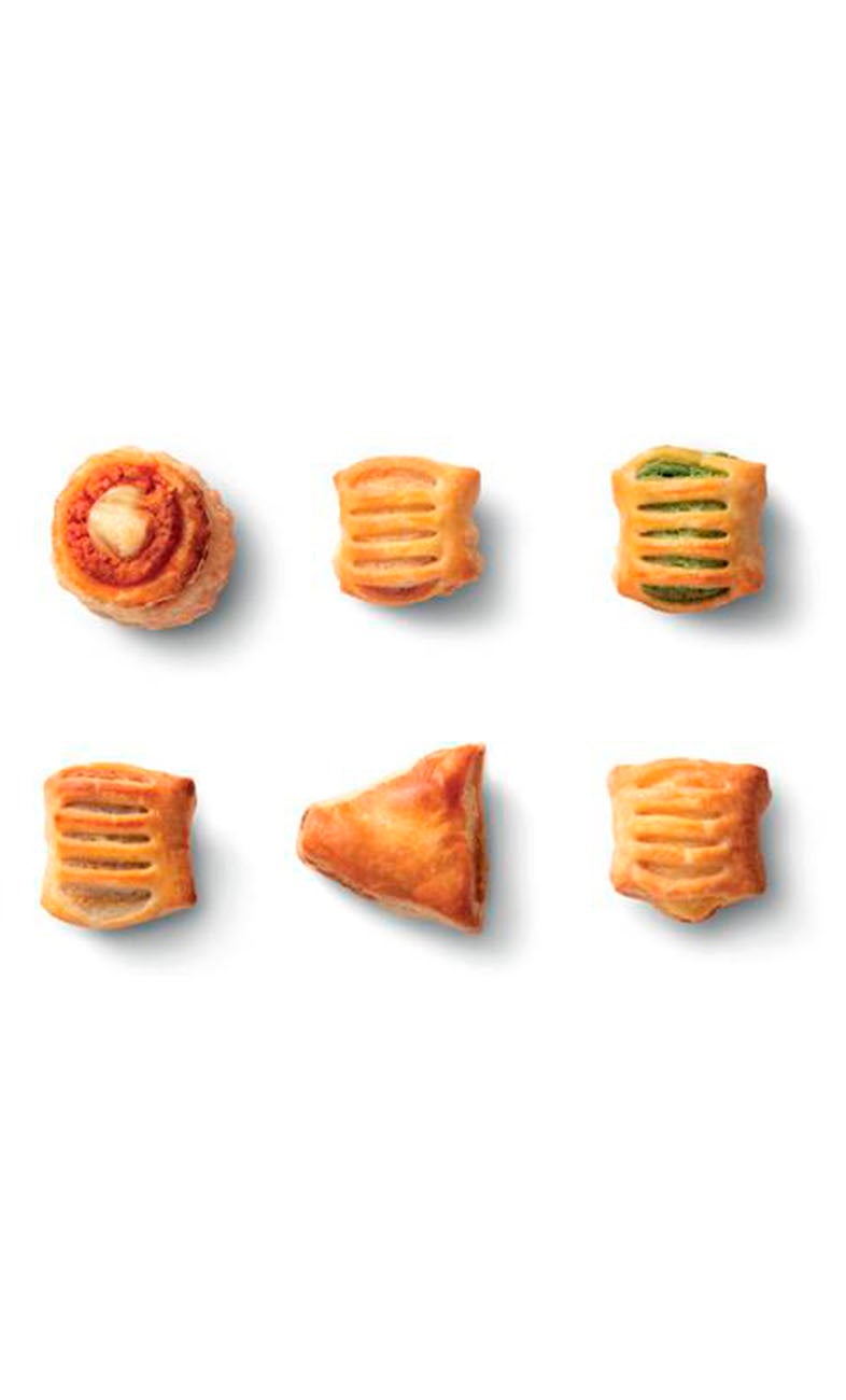 Pizzette, griglia agli spinaci, griglia al formaggio, griglia ai funghi, fagottino alle olive, triangolo all'acciuga, griglia ai peperoni, rotolino al wurstel, griglia al tonno, griglia al prosciutto.