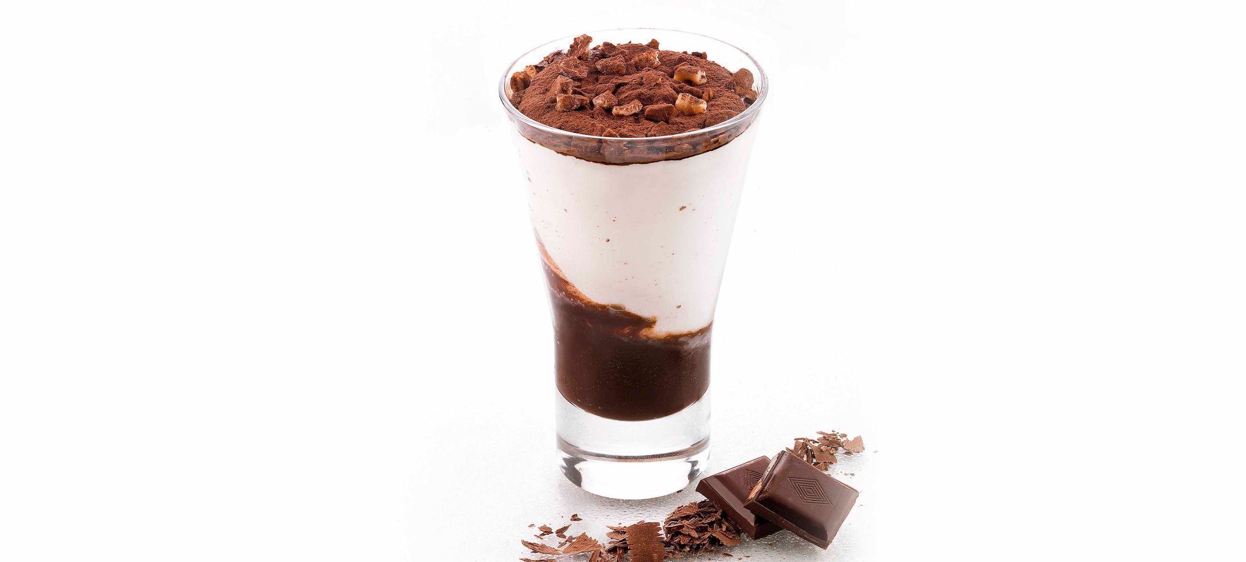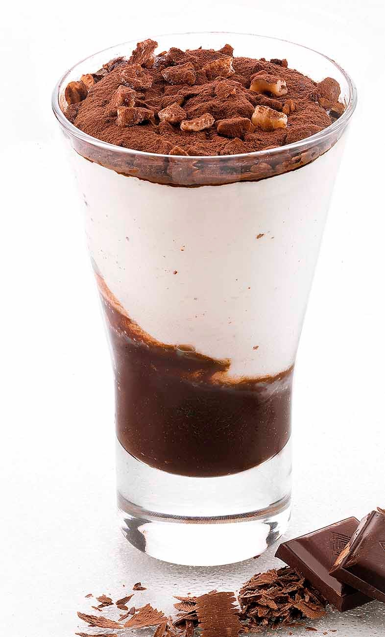 Coppa gelato alla stracciatella e cioccolato, decorata con nocciole pralinate. La coppa è in vetro.