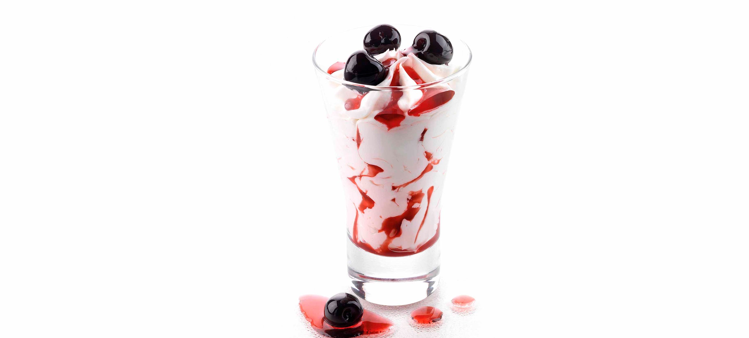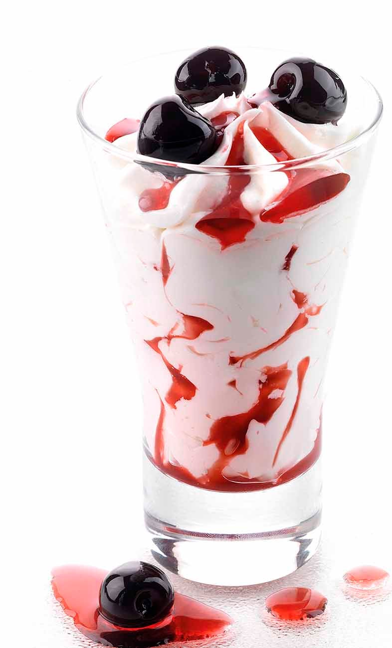 Coppa gelato alla panna variegato all’ amarena e decorata con ciliegie amarenate. La coppa è in vetro.