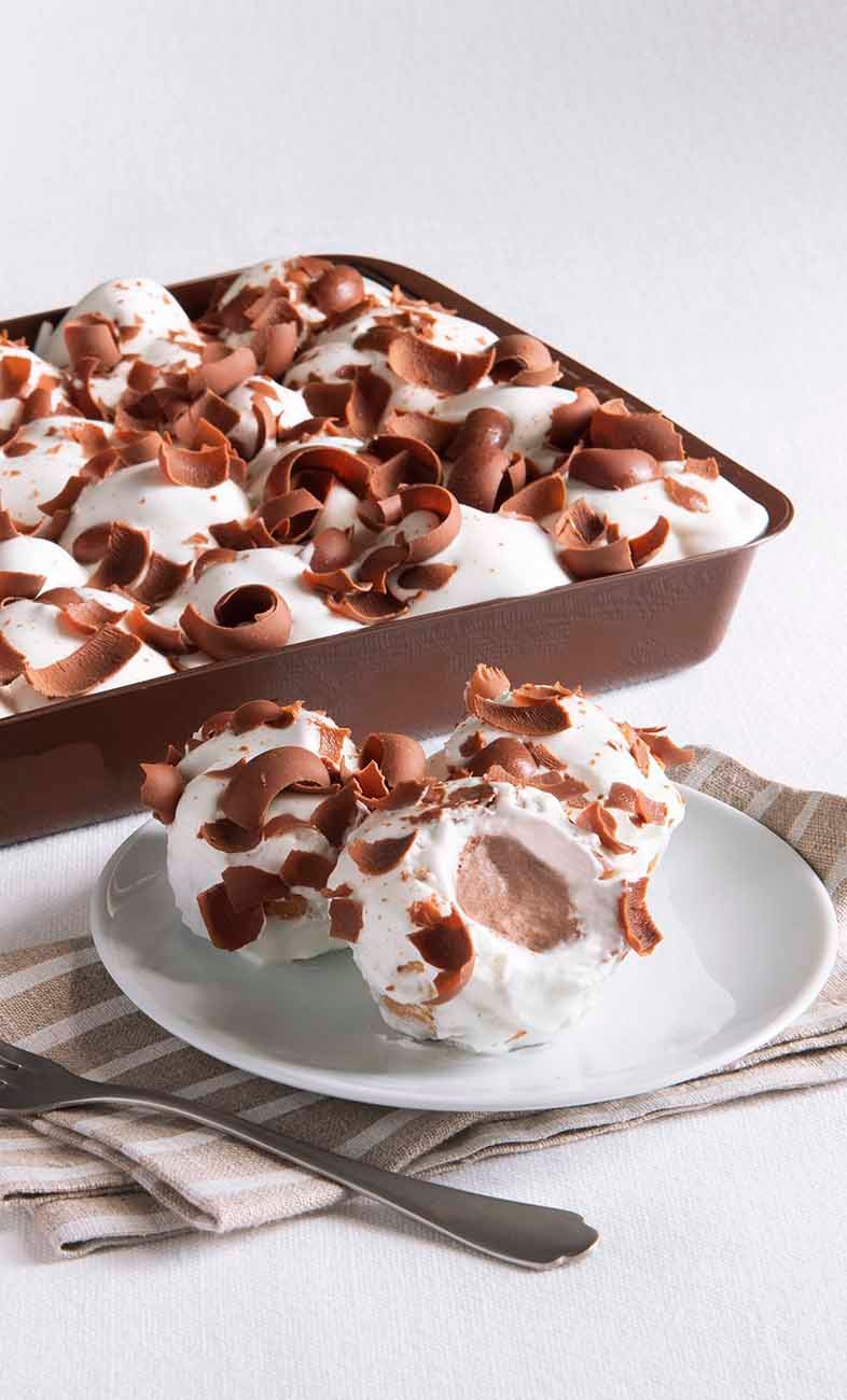 24 Bignè con crema al cioccolato e ricoperti con crema al gusto vaniglia.