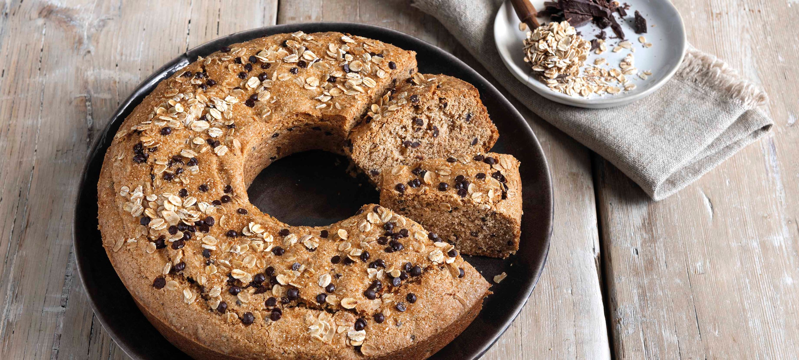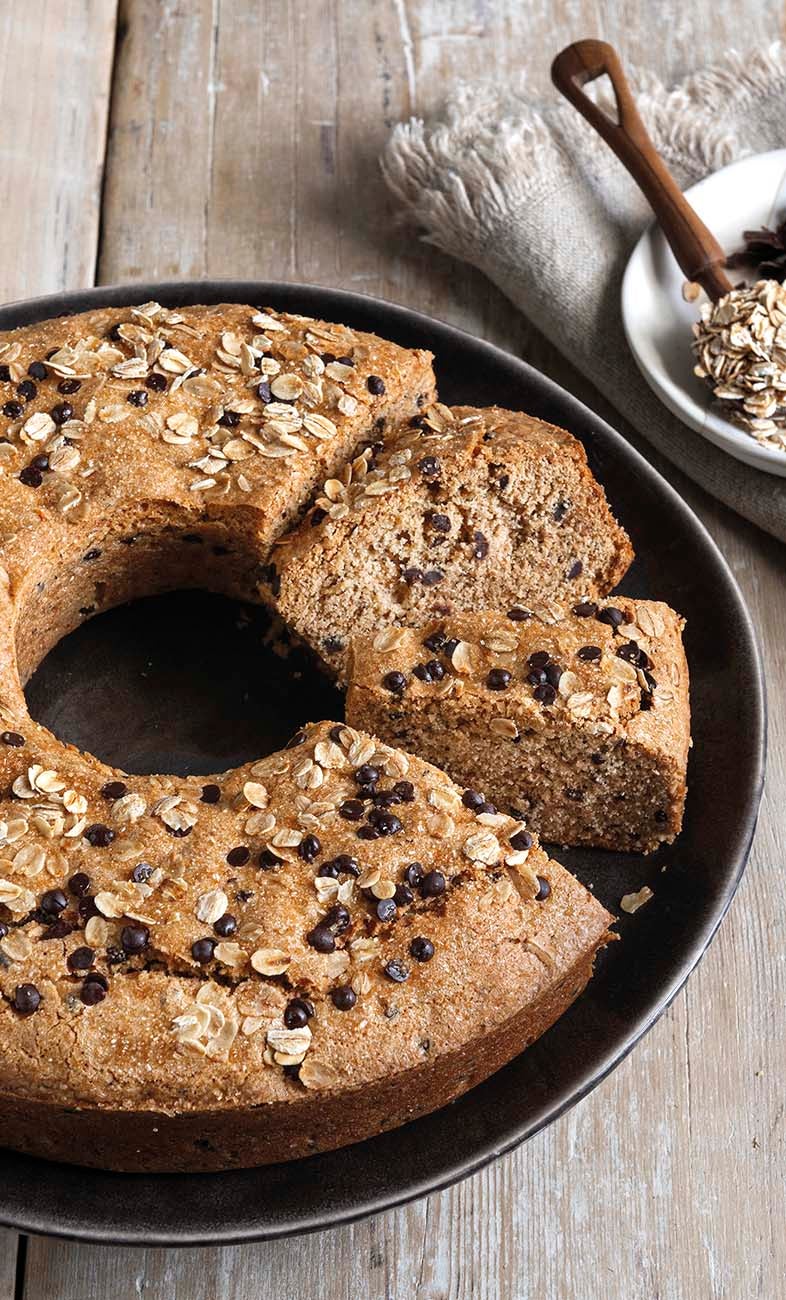 Un ciambellone soffice e goloso con un’esclusiva ricetta vegana. Ricco impasto con grano saraceno, gocce di cioccolato, decorato con fiocchi d’avena.