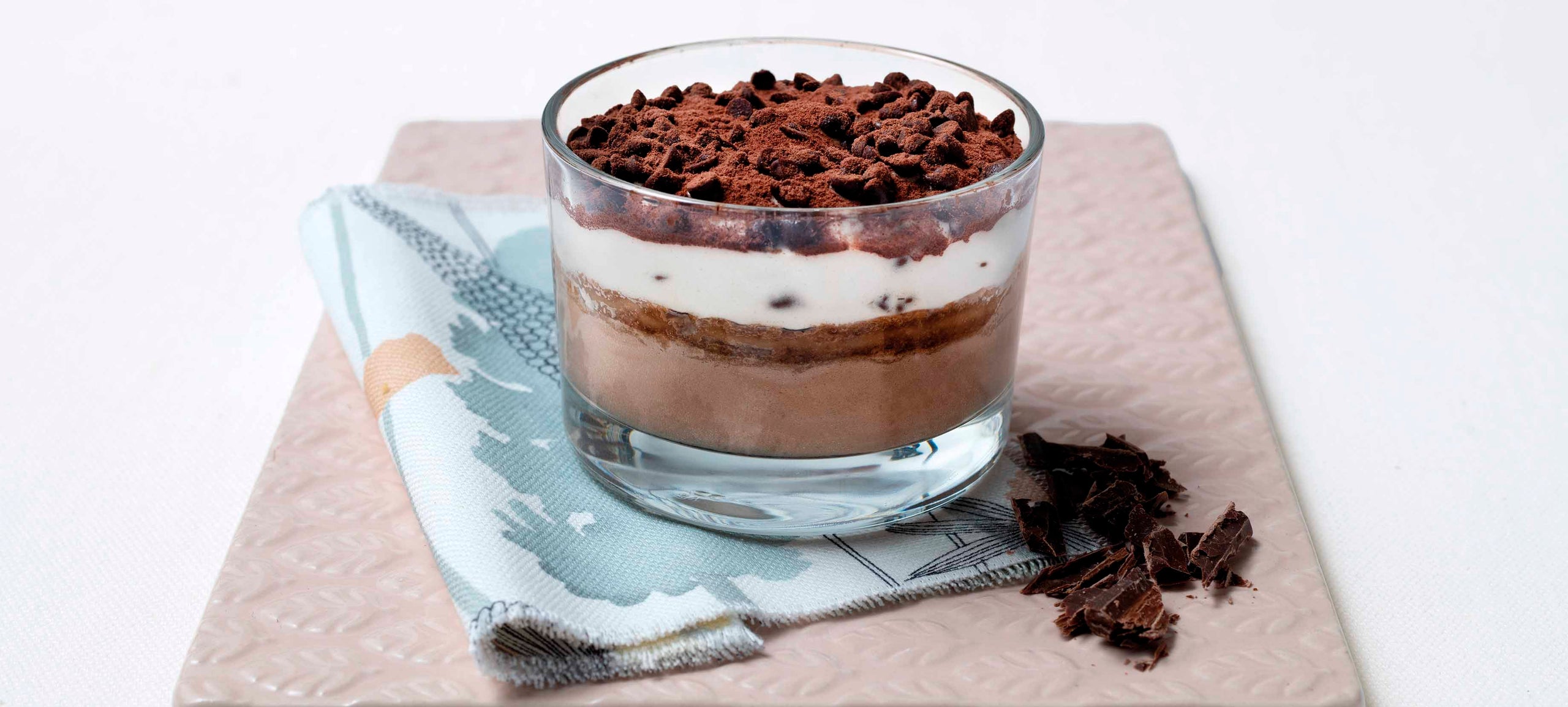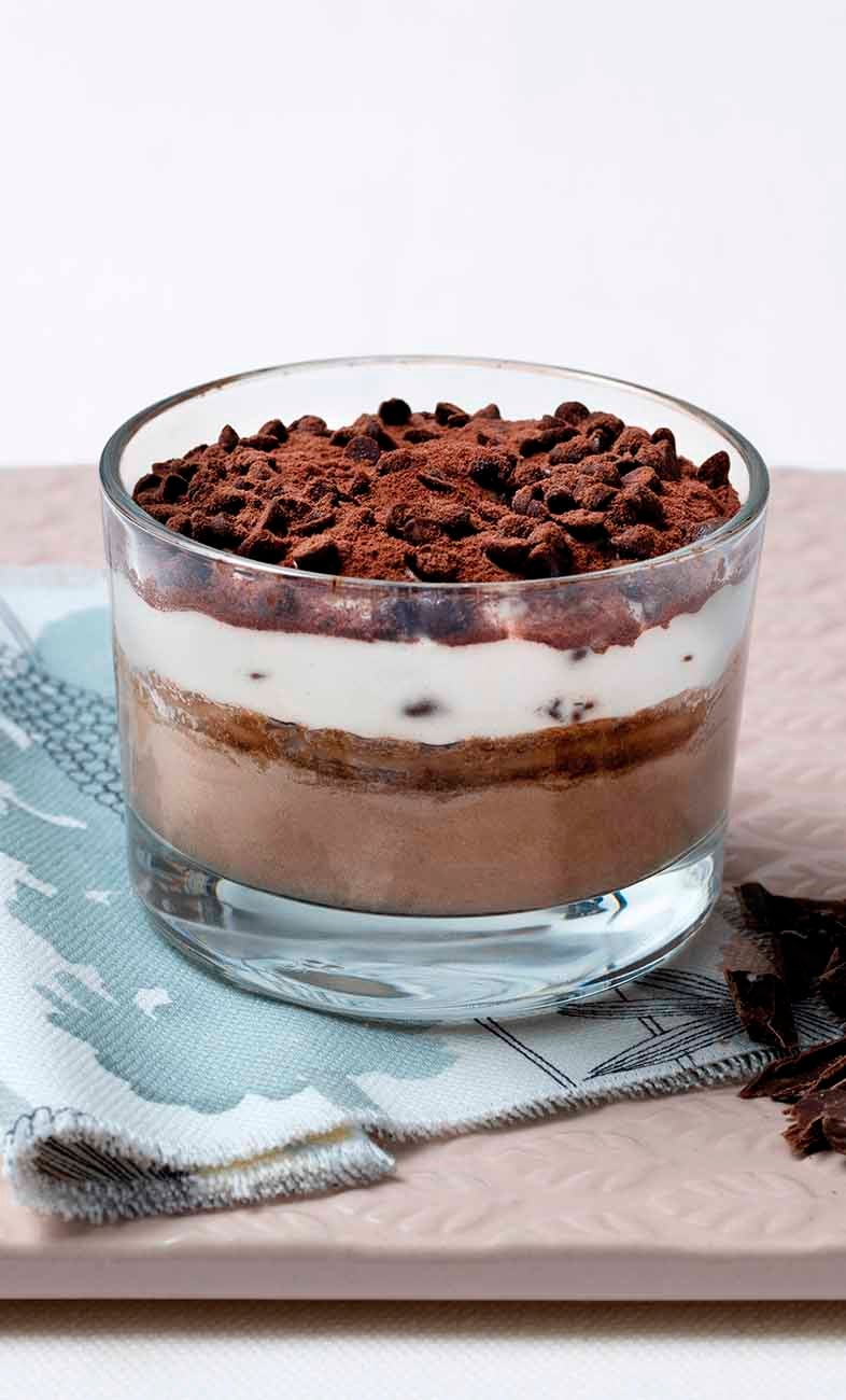 Un delizioso dessert vegano, composto da un morbido pan di Spagna inzuppato al caffè avvolto da una golosa crema al caffè e da una crema profumata alla vaniglia con gocce di cioccolato fondente; decorato con polvere di cacao e gocce di cioccolato fondente.
