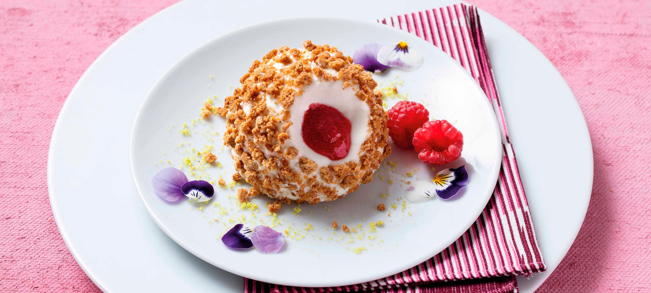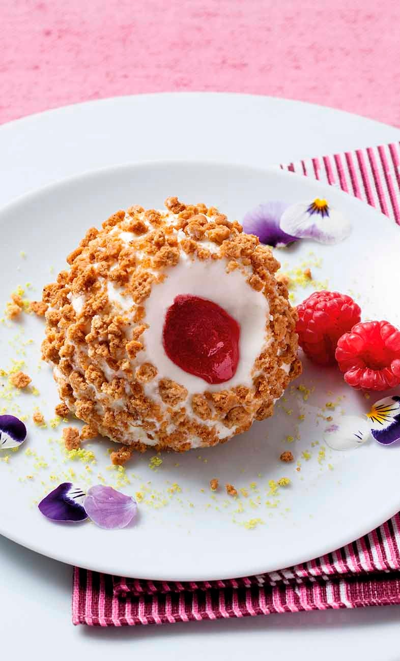 Il nuovissimo tartufo Bindi con gelato cheesecake e una golosa salsa alle fragole e lamponi, ricoperto da un croccante crumble di pasta frolla al burro.