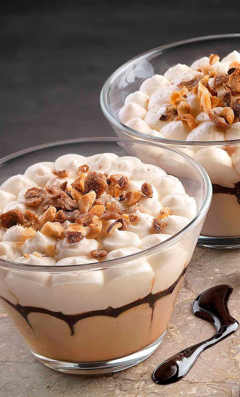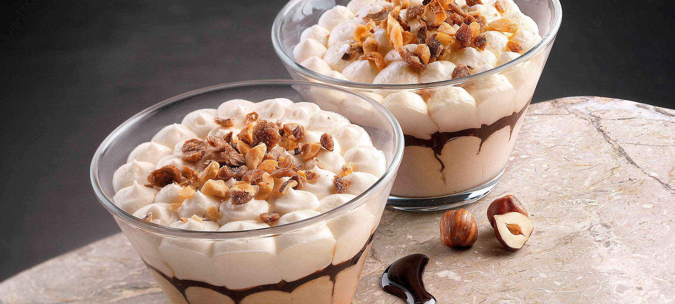 Gelato semifreddo al caffè e chantilly con salsa al cioccolato e caffè e nocciole pralinate. Coppa in vetro.
