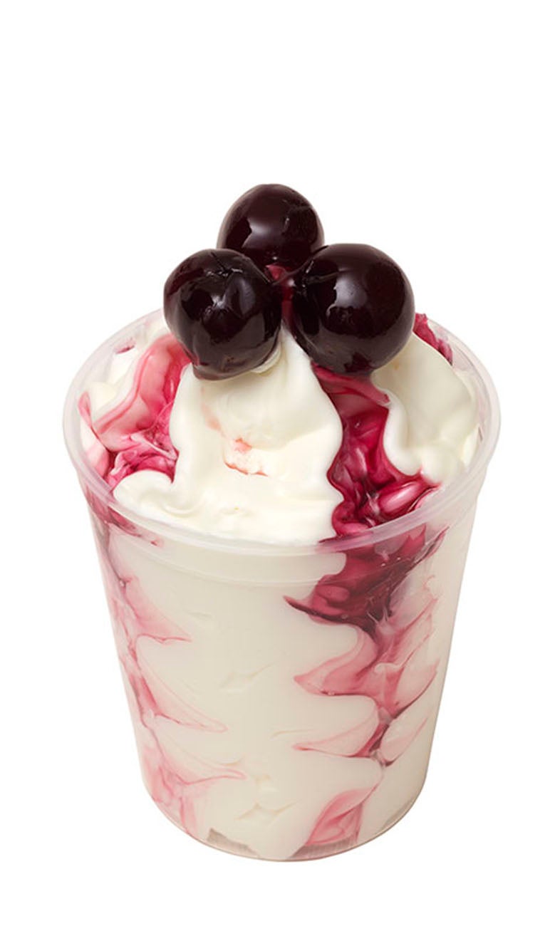 Gelato alla panna con variegatura all'amarena, decorato con tre ciliegie amarenate candite.