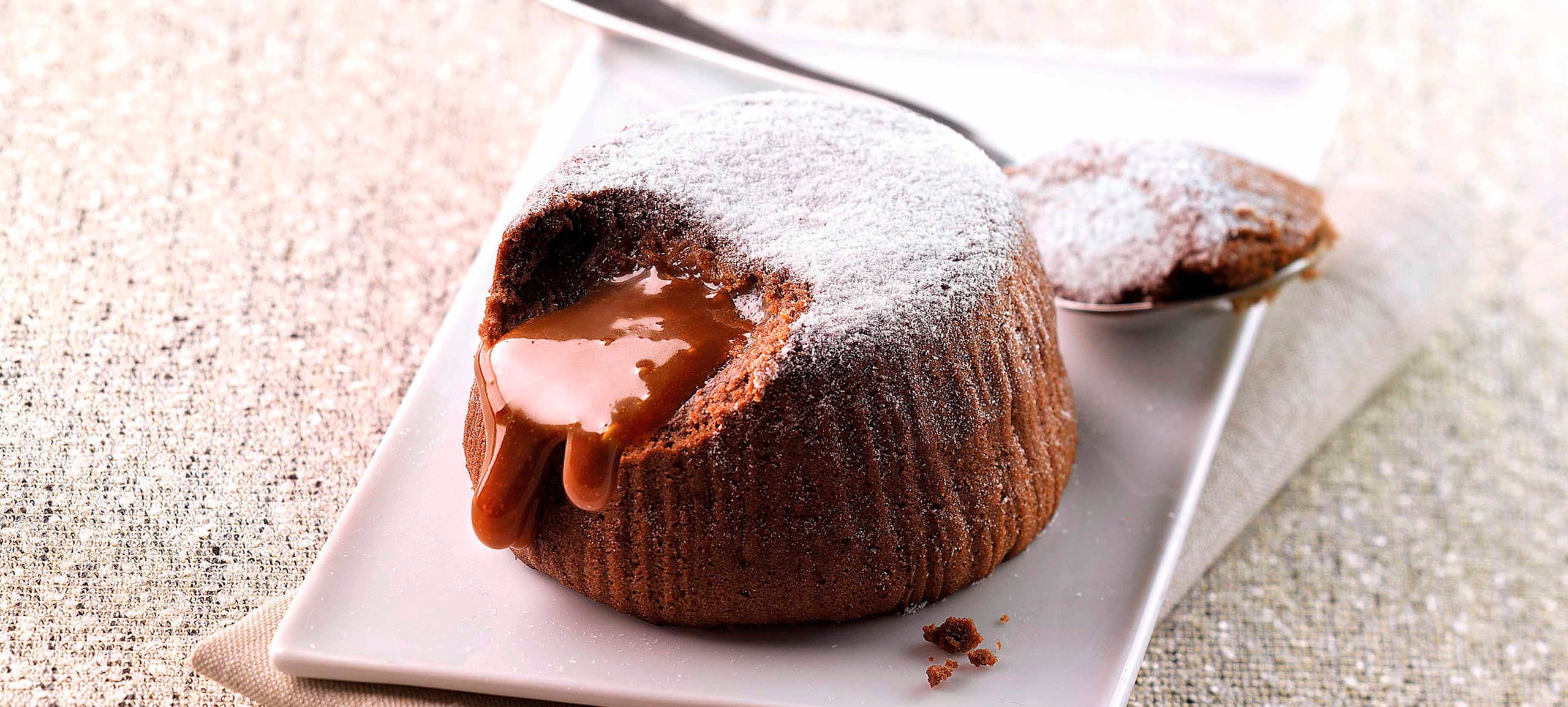 Soufflé al cioccolato con cuore al caramello salato liquido.