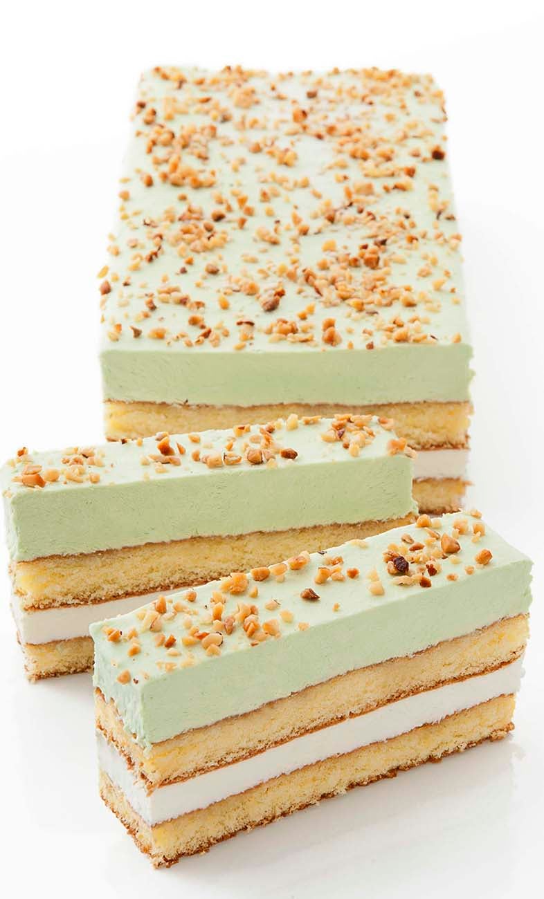 Pan di Spagna con crema al gusto mandorla e crema al gusto pistacchio con granella di nocciole.