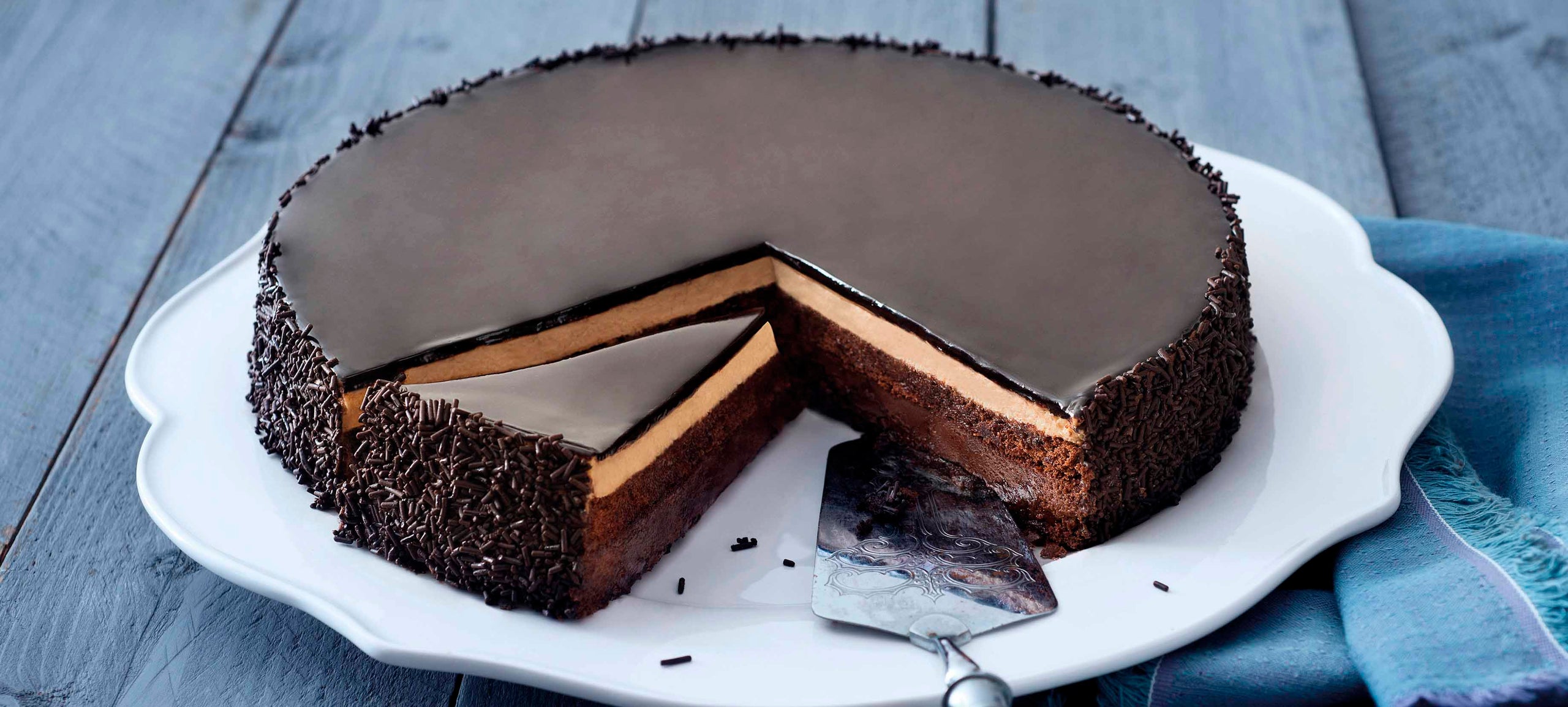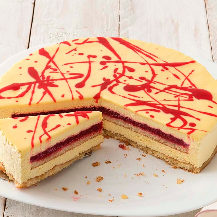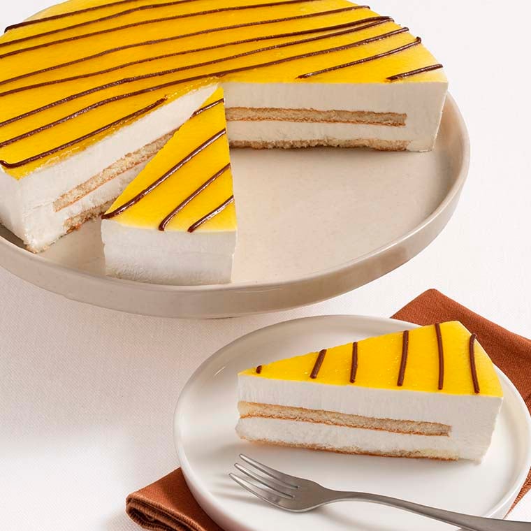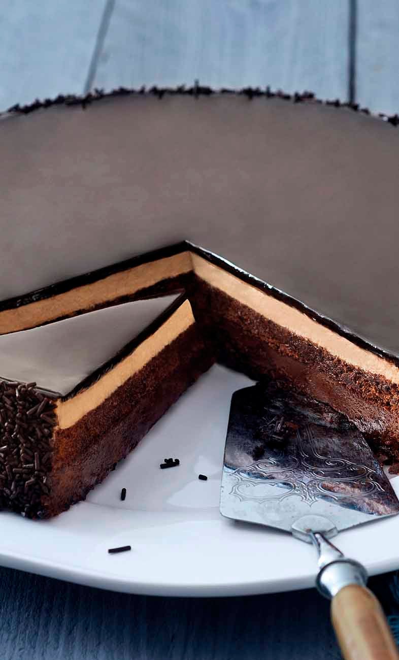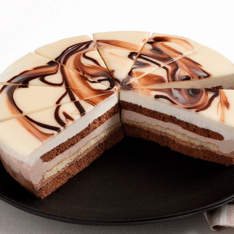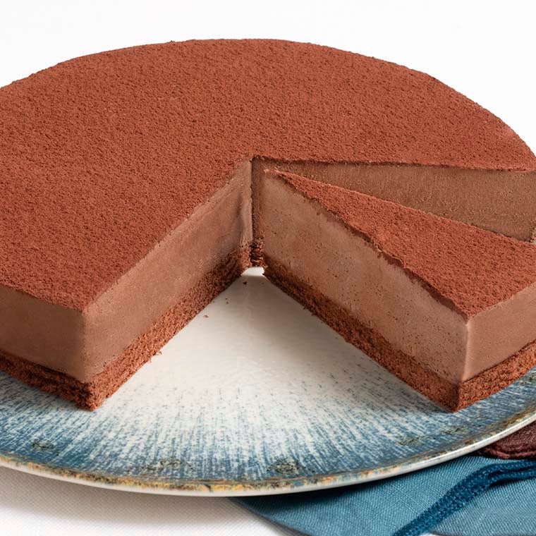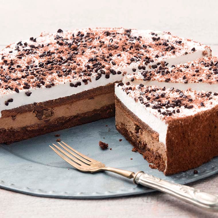 Crema con cioccolato con cacao monorigine dell’Ecuador, crunch alla nocciola e crema alla nocciola tra due strati di morbido Pan di Spagna al cacao, ricoperta da una gustosa glassa al cioccolato