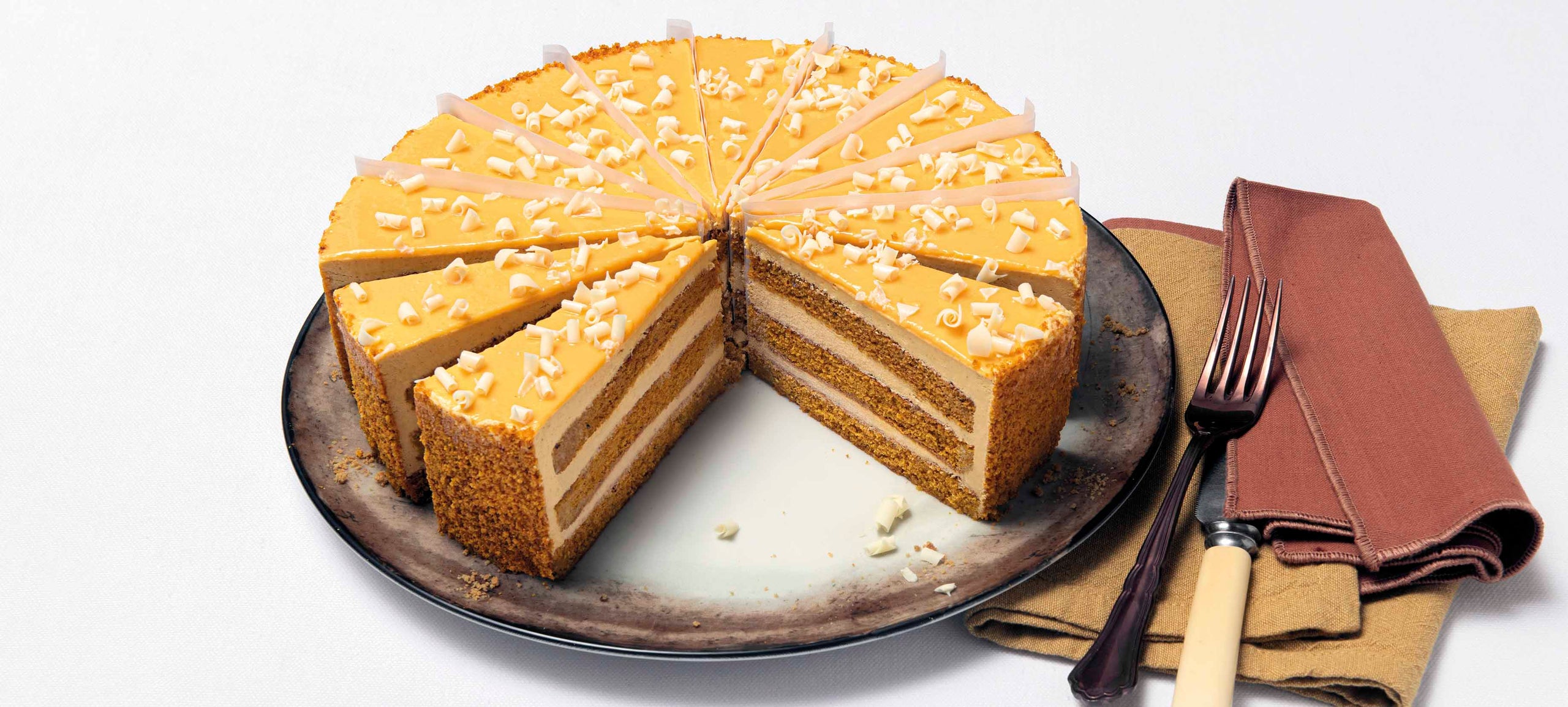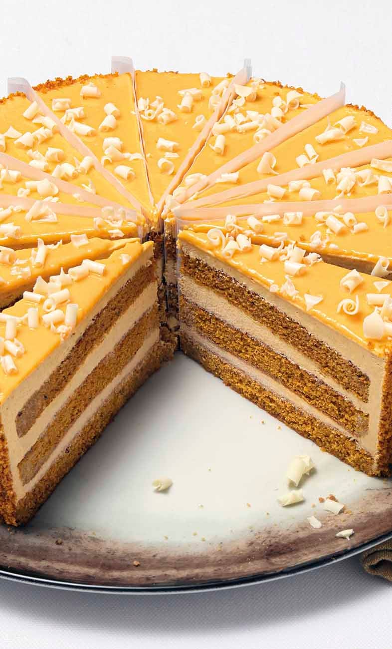 La tipica torta autunnale americana composta da morbidi pan di Spagna alla carota, alternati con una golosa crema alla zucca, arricchita con zenzero, cannella e chiodi di garofano. Decorata con riccioli di cioccolato bianco. Edizione Limitata.
