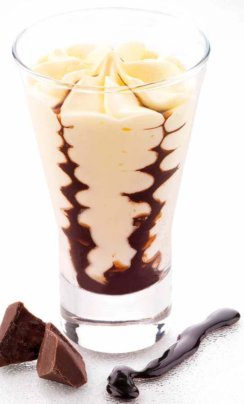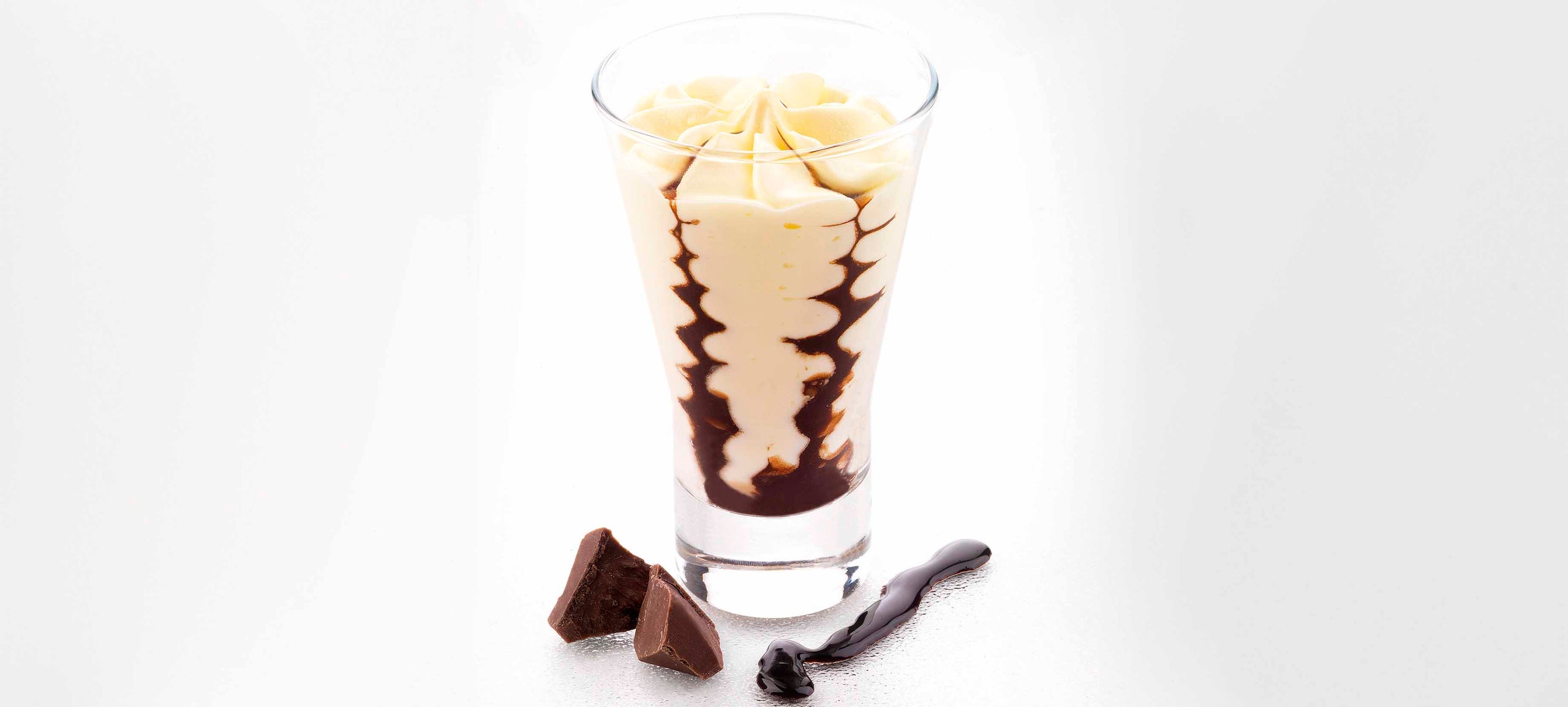 Coppa gelato alla crema variegato al cioccolato fondente. La coppa è in vetro.
